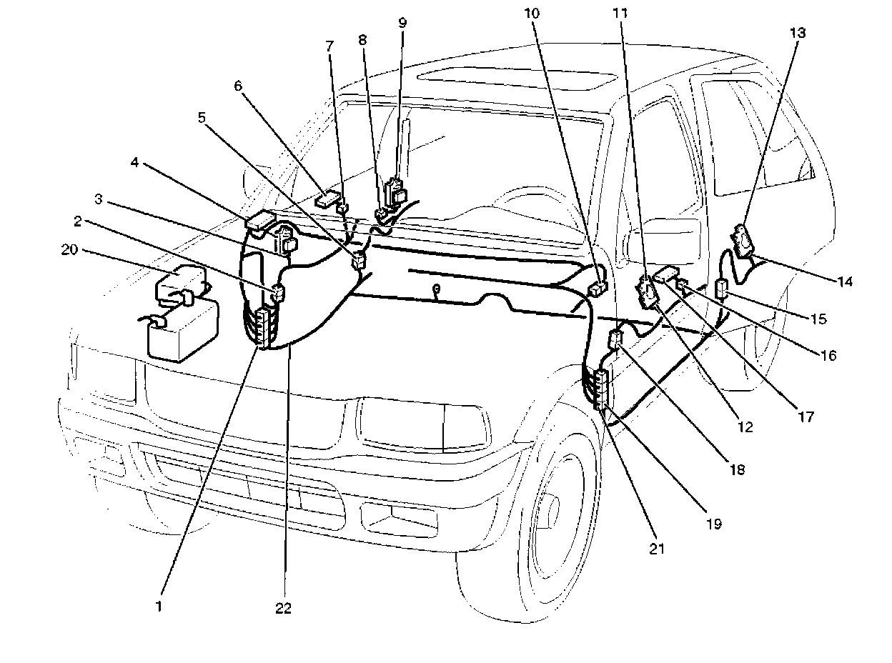 The parts location shows the location of the connectors (20) and the harness (21) used in each harness routing (22).