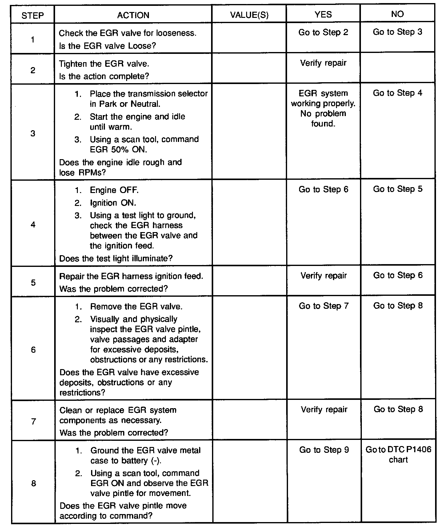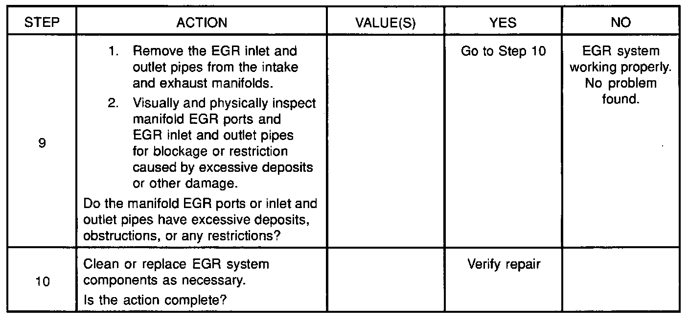 The EGR valve chart is a check of the EGR system. An EGR pintle constantly in the closed position could cause detonation and high emissions of NOx. It could also result in high long term fuel trim values in the open throttle cell, but not in the closed throttle cell. An EGR pintle constantly in the open position would cause a rough idle. Also, an EGR mounted incorrectly (rotated 1800) could cause rough idle. Check for the following items: