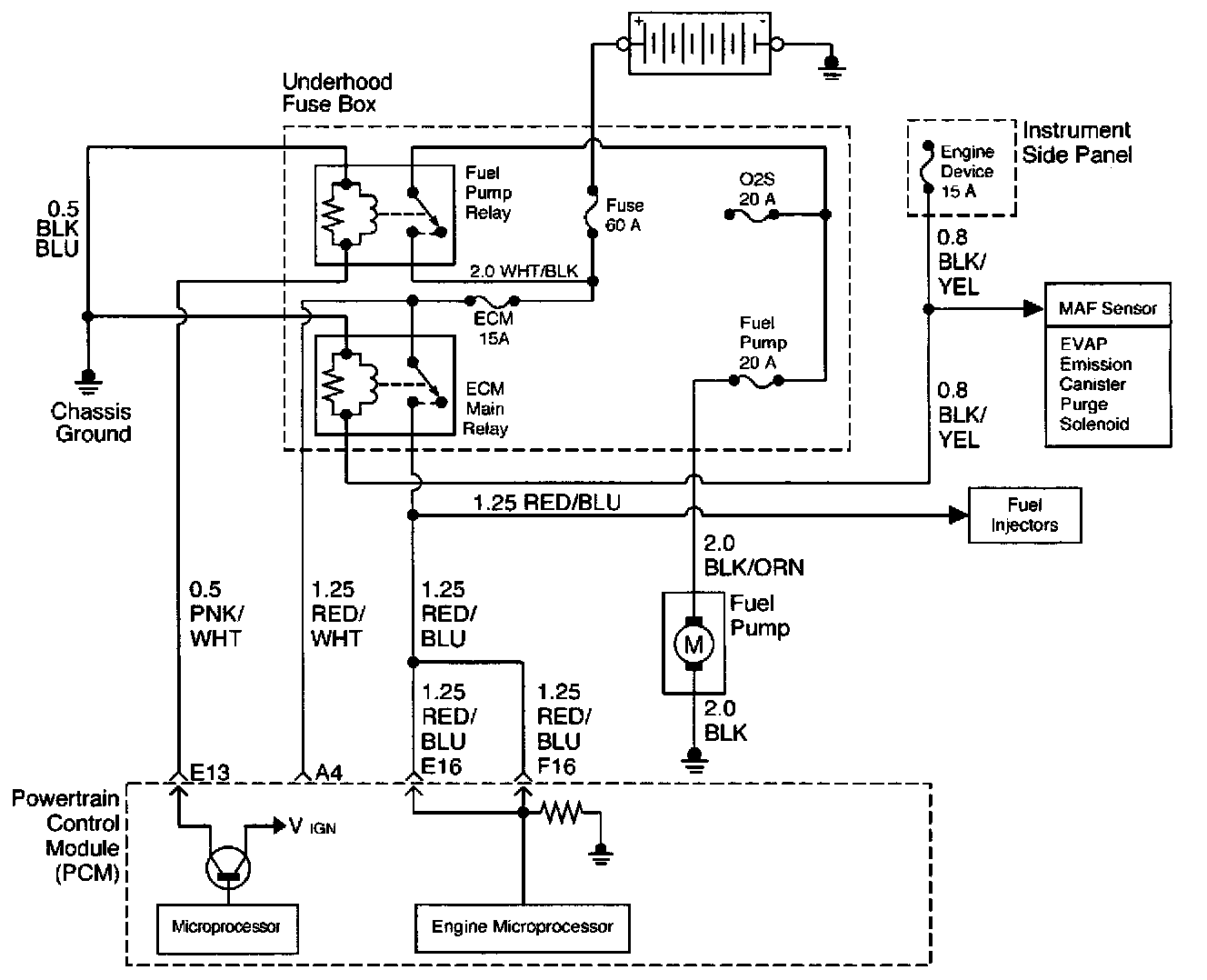 When the ignition switch is first turned ON, the powertrain control module (PCM) energizes the fuel pump relay which applies power to the in-tank fuel pump. The fuel pump relay will remain ON as long as the engine is running or cranking and the PCM is receiving 58X crankshaft position pulses. If no 58X crankshaft position pulses are present, the PCM de-energizes the fuel pump relay within 2 seconds after the ignition is turned ON or the engine is stopped.