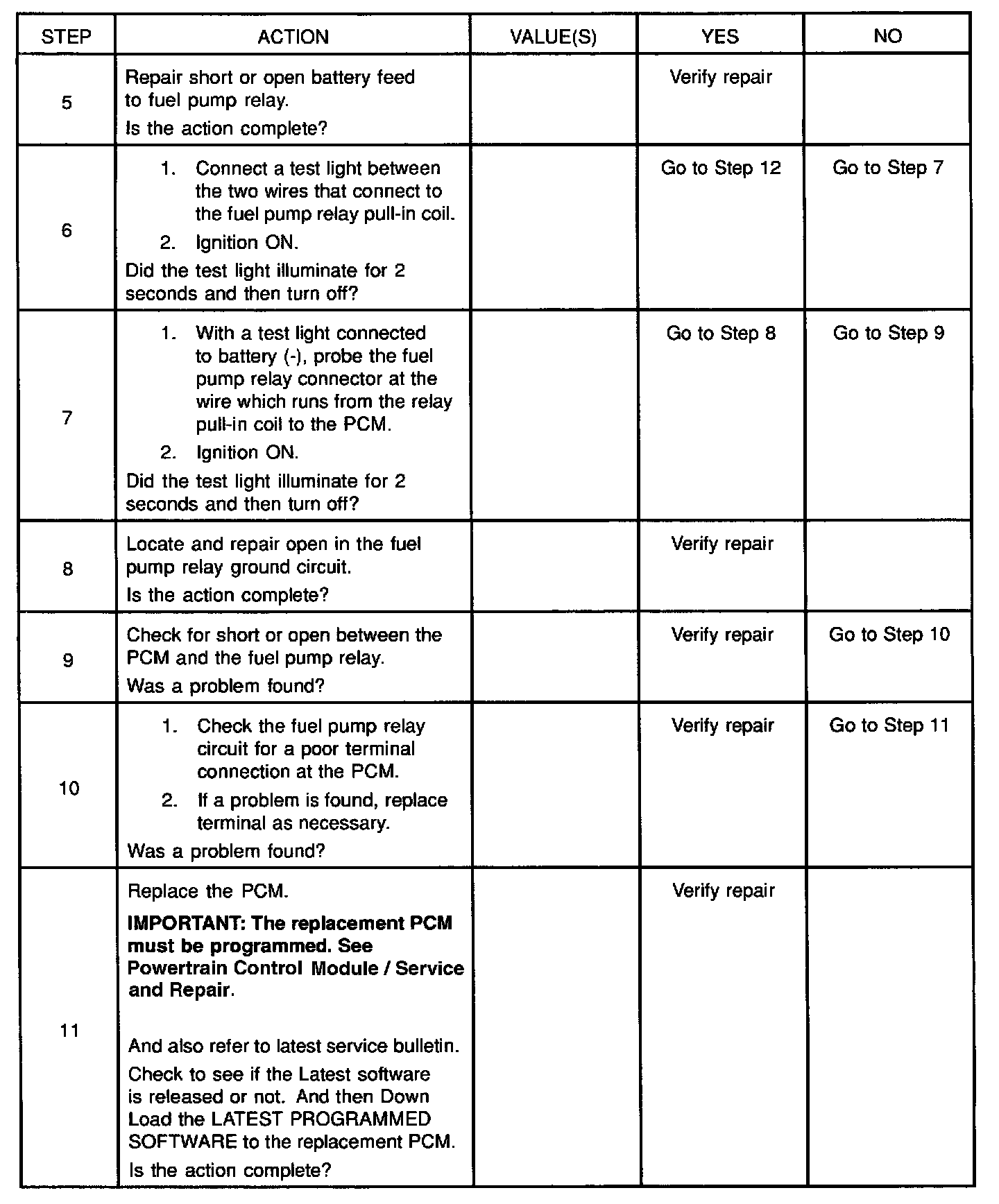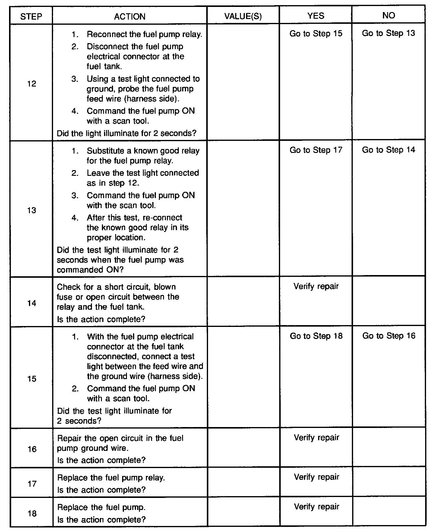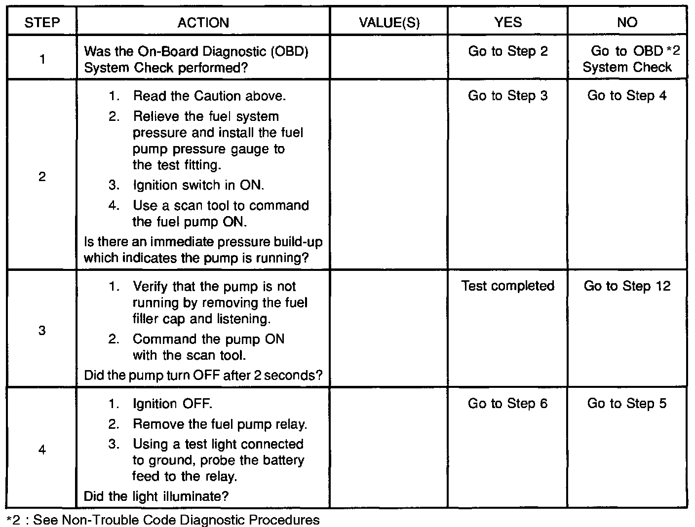 2. If the fuel pump is operating but incorrect pressure is noted, the fuel pump wiring is OK and the Fuel System Pressure Test chart should be used for diagnosis.
