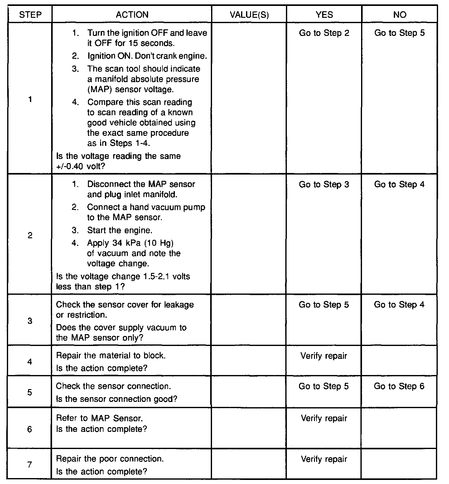 1. Applying 34 kPa (10 Hg) vacuum to the MAP sensor should cause the voltage to be 1.5-2.1 volts less than the voltage at step 1. Upon applying vacuum to the sensor, the change in voltage should be instantaneous. A slow voltage change indicates a faulty sensor.