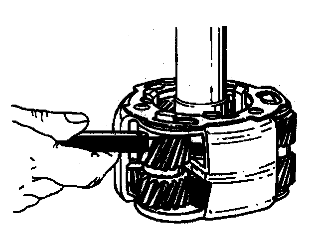 12. Align planetary pinions. Each pinion is marked with double points to indicate the master tooth space and exactly opposite with a single point to indicate the master tooth. The markings on the planetary carrier consist of double lines which are to be lined up with the double points on two opposite pinions; the single lines are to be lined up with the single points on the other two pinions.