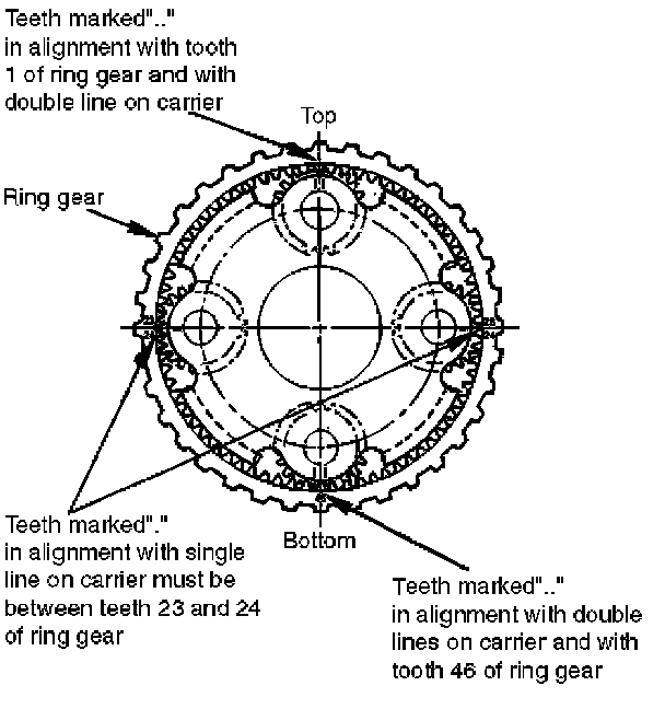 - After all four pinions are lined up, slide on the third clutch assembly. Rotate third clutch and check mark alignment. Considering that the ring gear tooth between the double points of one planetary pinion is tooth number 1, count the teeth to check that the single points on the two adjacent pinions are between teeth 23 and 24 of the ring gear, and that the ring gear tooth between the double points of the opposite pinion is tooth number 46. If the ring gear and pinions are not lined up, remove and realign them.