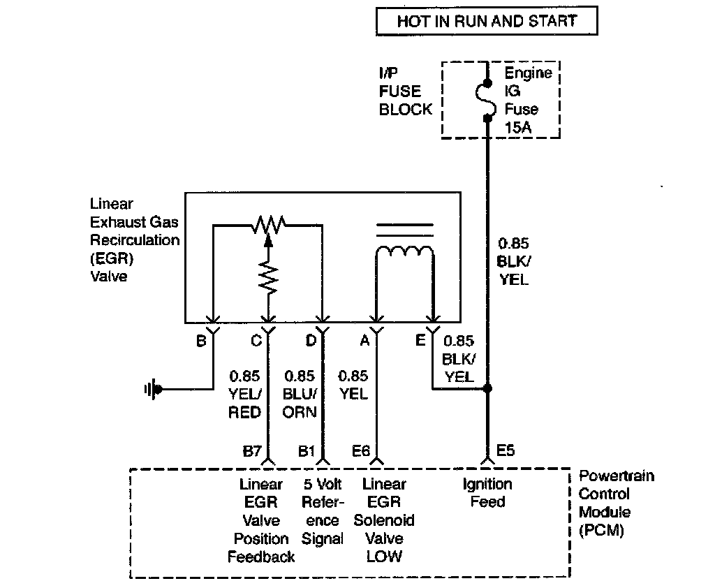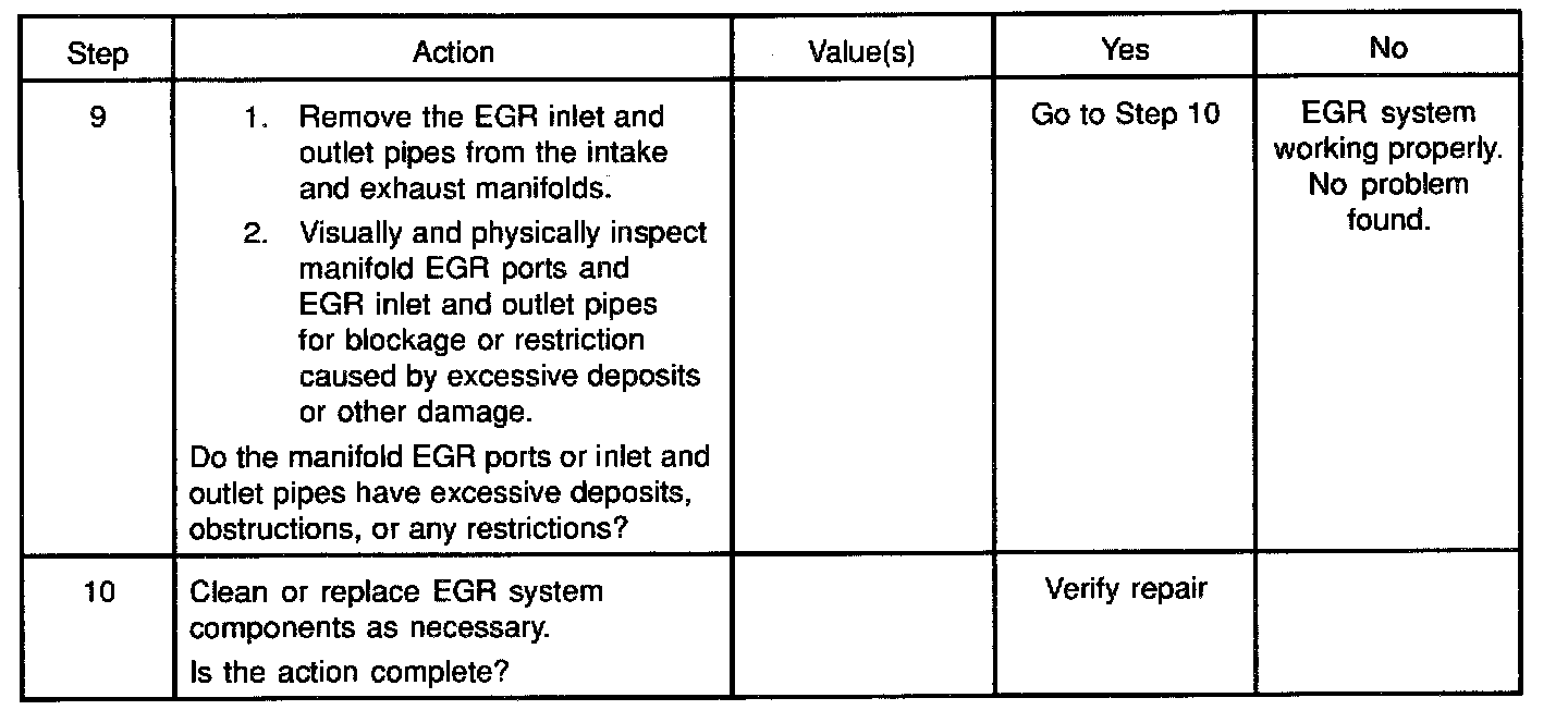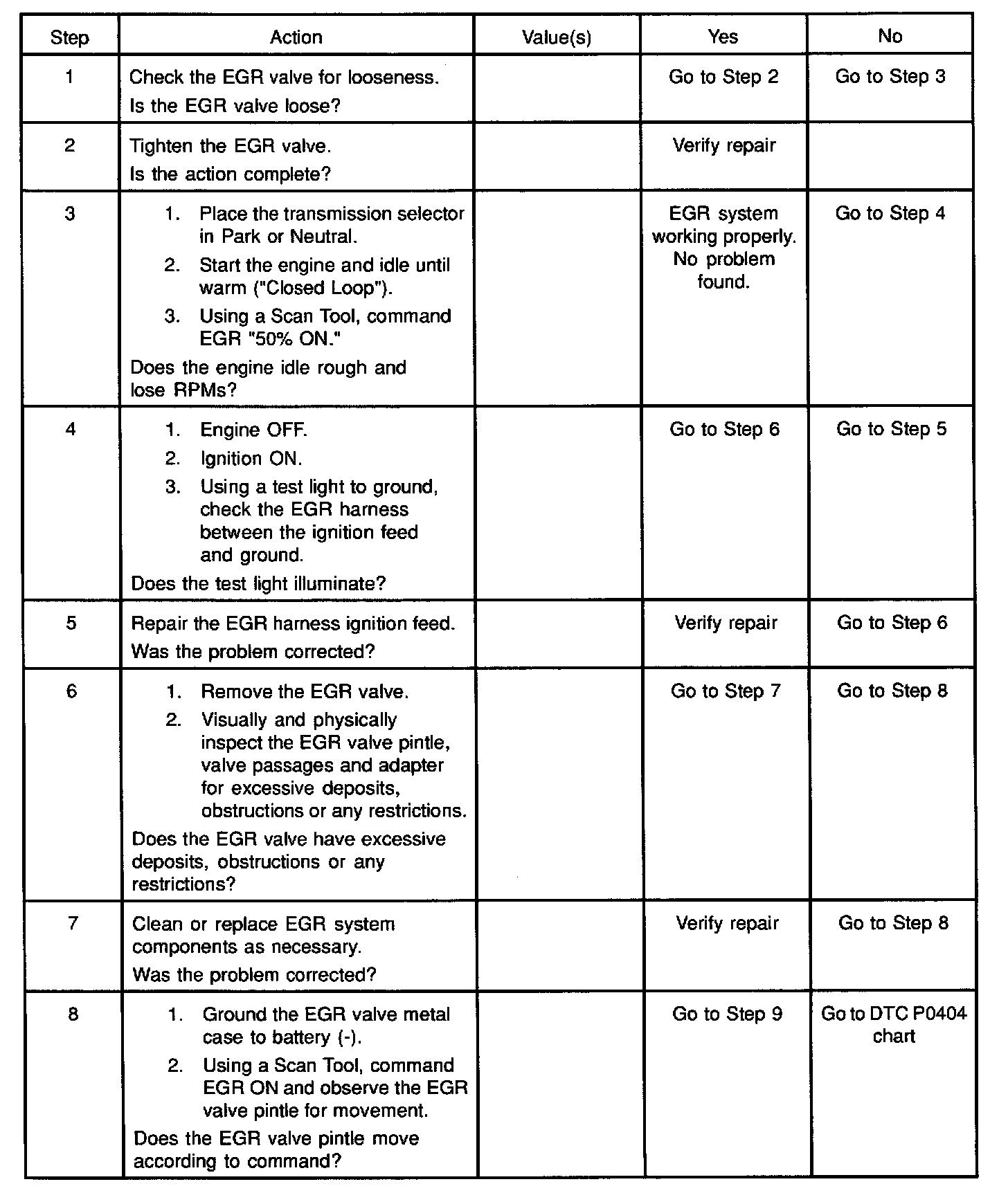The EGR valve chart is a check of the EGR system. An EGR pintle constantly in the closed position could cause detonation and high emissions of NOx. It could also result in high long term fuel trim values in the open throttle cell, but not in the closed throttle cell. An EGR pintle constantly in the open position would cause rough idle. Also, an EGR valve mounted incorrectly (rotated 180 °) could cause a rough idle without setting an EGR DTC. Check for the following items: