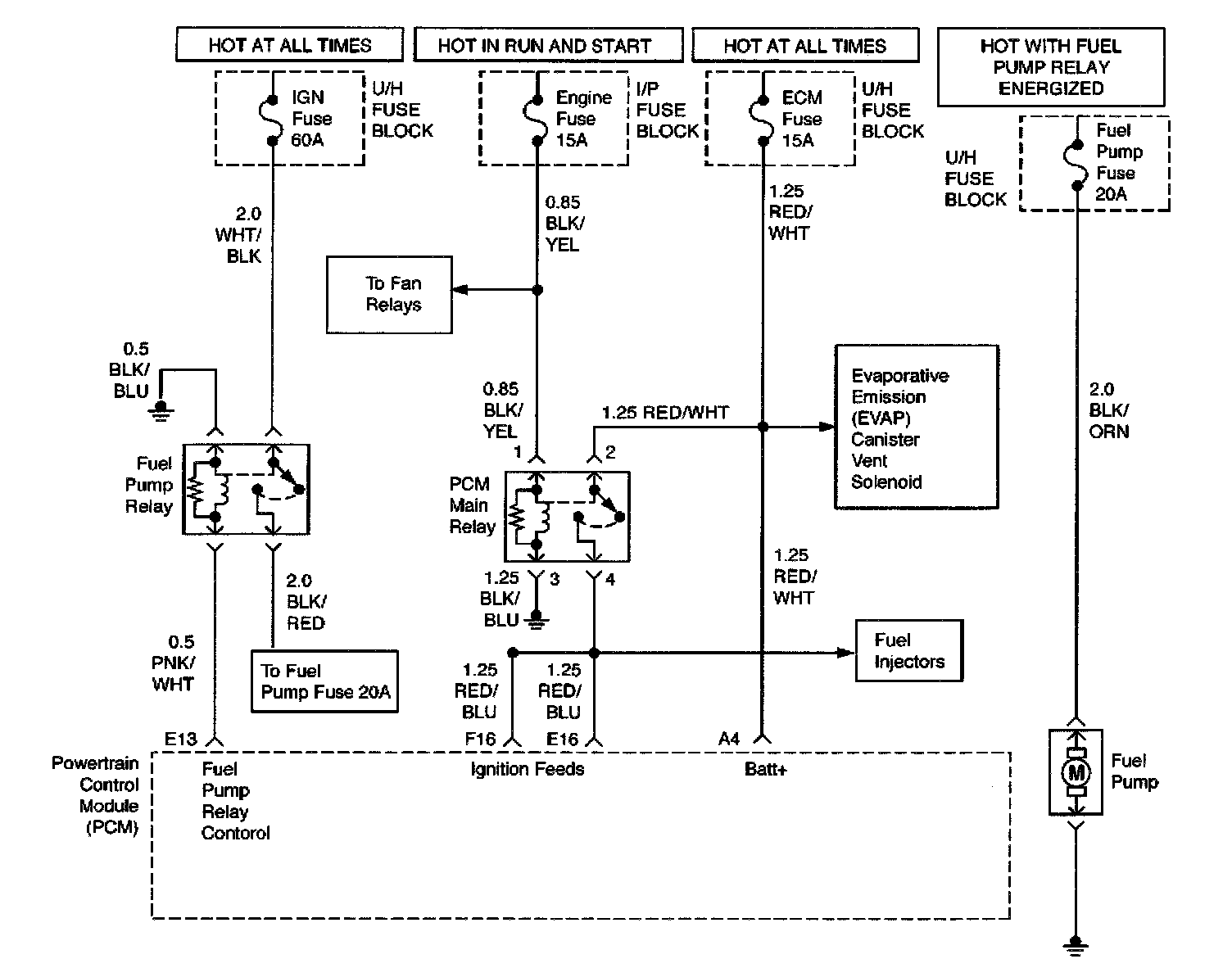 When the ignition switch is first turned ON, the powertrain control module (PCM) energizes the fuel pump relay which applies power to the in-tank fuel pump. The fuel pump relay will remain ON as long as the engine is running or cranking and the PCM is receiving 58X crankshaft position pulses. If no 58X crankshaft position pulses are present, the PCM de-energizes the fuel pump relay within 2 seconds after the ignition is turned ON or the engine is stopped.