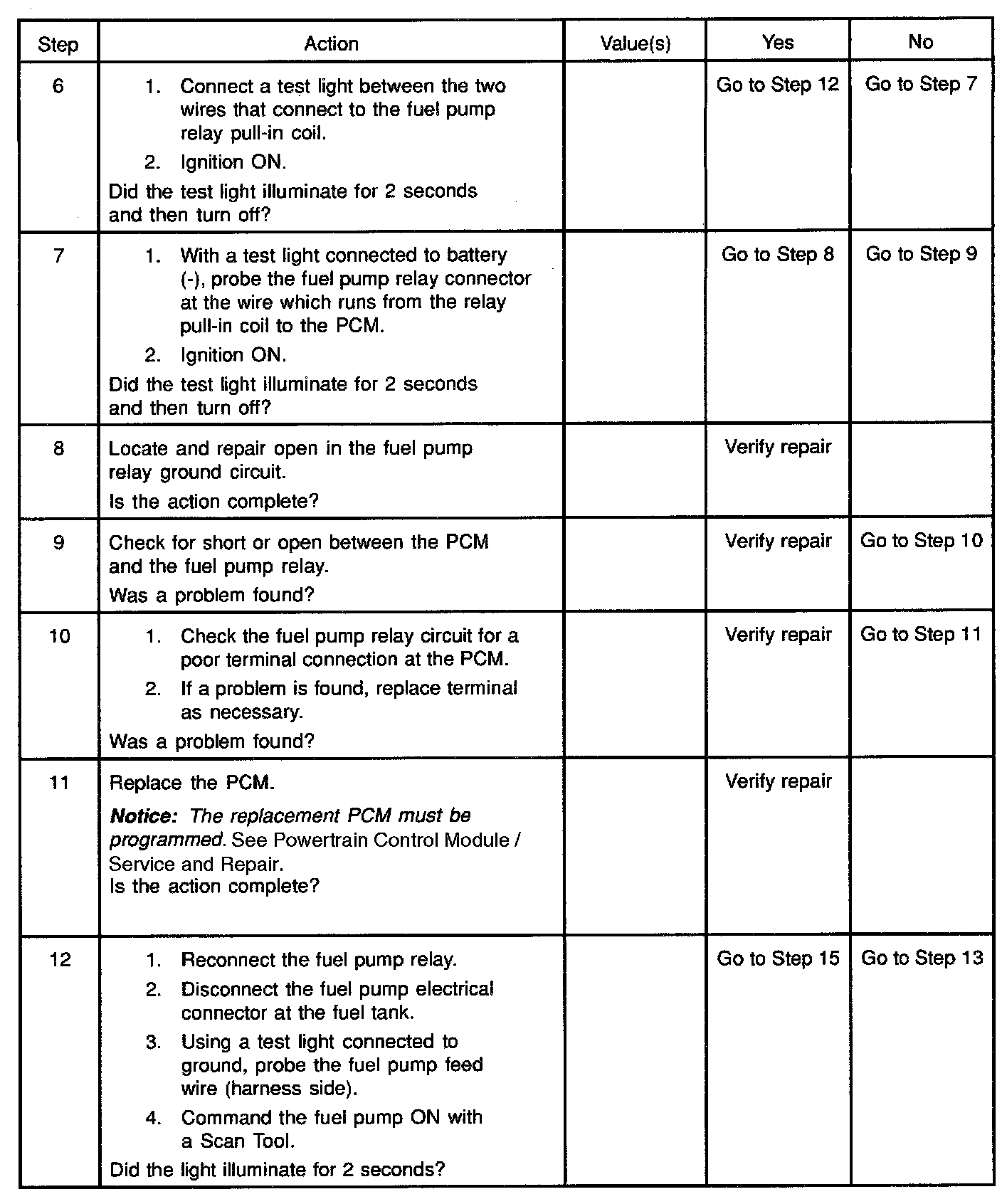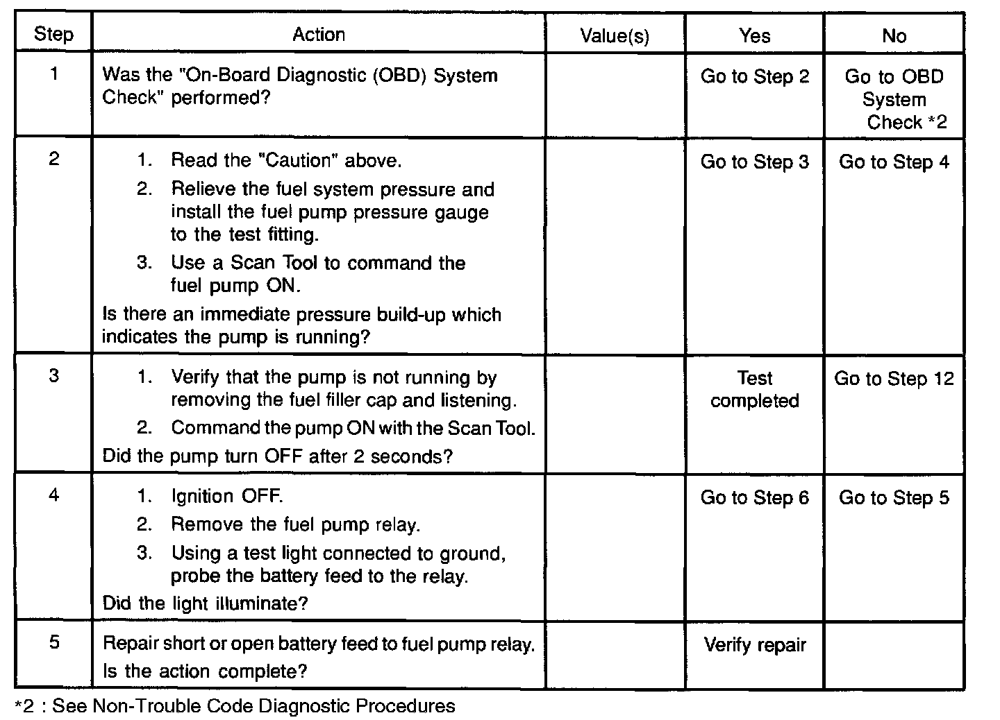 2. If the fuel pump is operating but incorrect pressure is noted, the fuel pump wiring is OK and the "Fuel System Pressure Test" chart should be used for diagnosis.