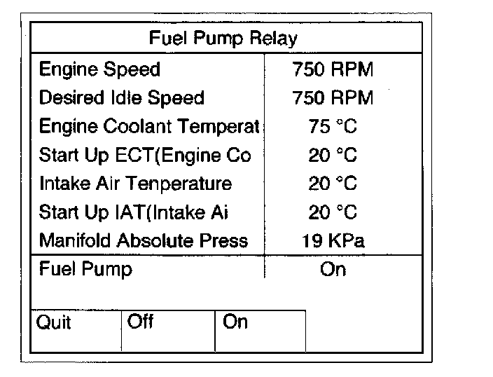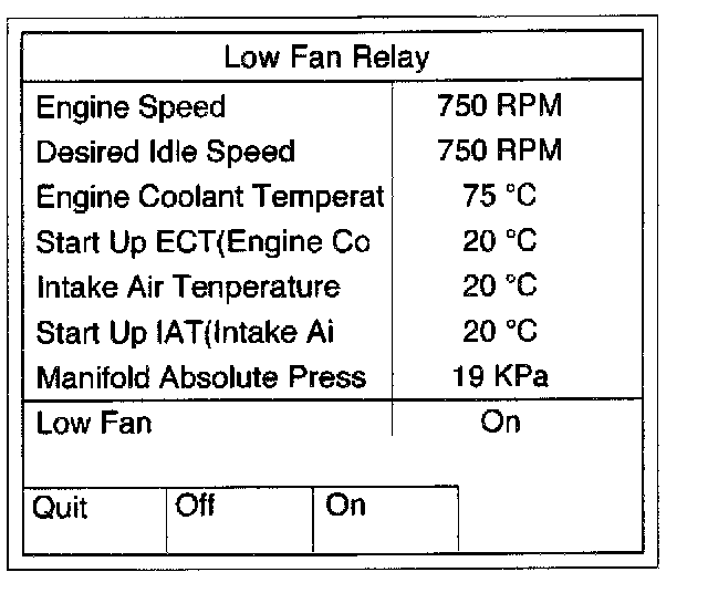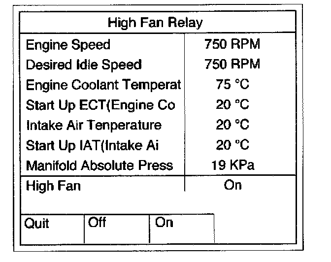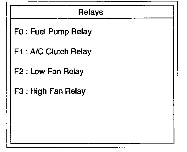 This test is conducted to check Fuel Pump Relay, A/C Clutch Low Fan and High Fan for proper operation.Tech 2 must be used for this test.