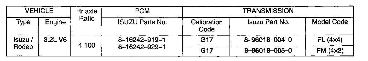 The chart contains a list of all important information concerning rear axle ratio, Powertrain Control Module (PCM), and transmission identification.
