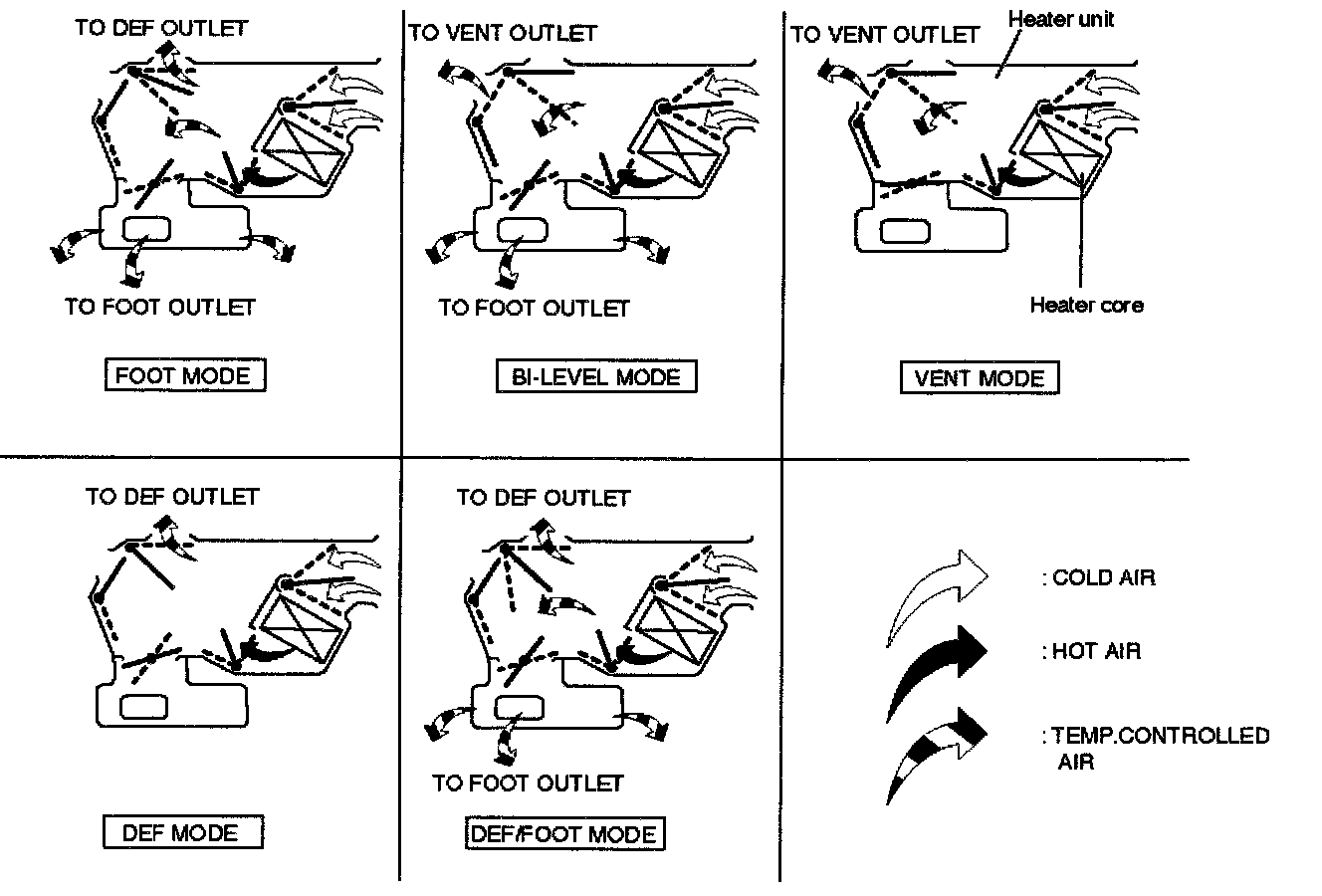 Placing the knob in a intermediate position will cause a lesser or greater amount air to reach the heater core. In this mode the passenger compartment temperature can be regulated