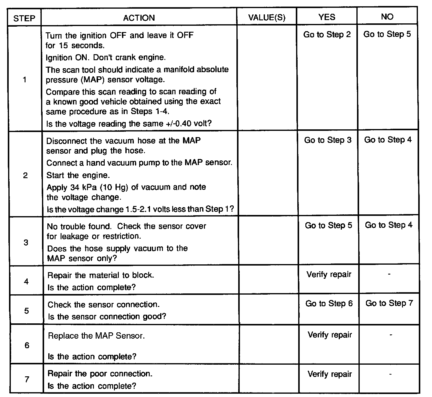 2. Applying 34 kPa (10 Hg) vacuum to the MAP sensor should cause the voltage to be 1.5 - 2.1 volts less than the voltage at step 1. Upon applying vacuum to the sensor, the change in voltage should be instantaneous. A slow voltage change indicates a faulty sensor.
