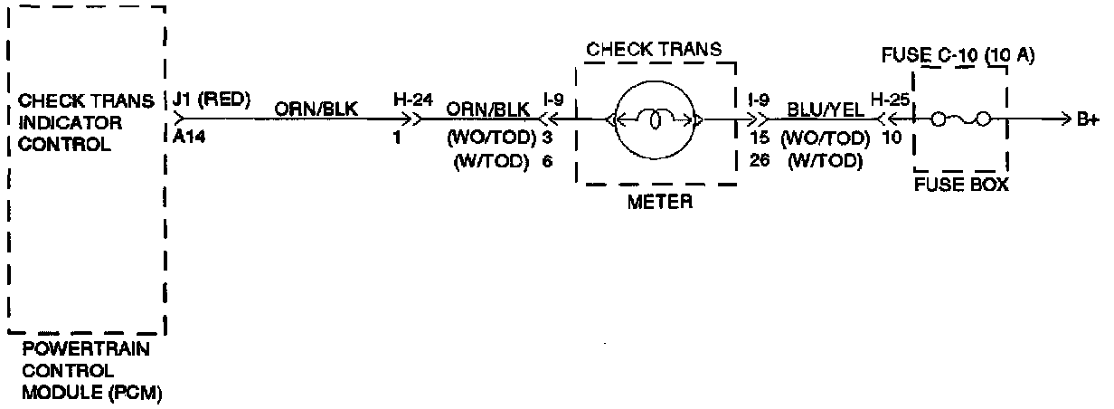 2. Verify if instrument panel terminal 3 (WO/TOD) or 6 (W/TOD) of connector I-9 is shorted to battery or open.