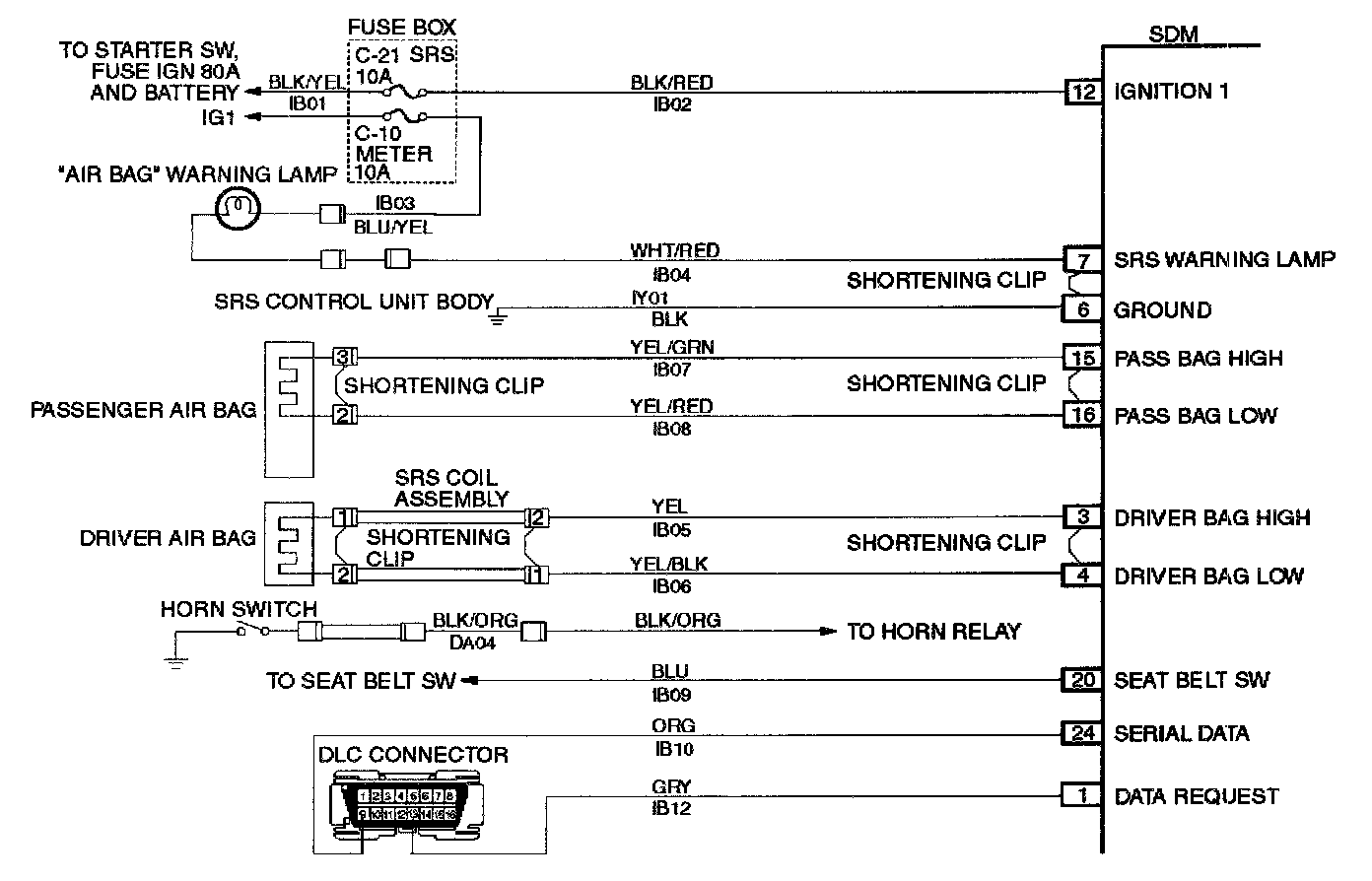 When the SDM recognizes "Ignition 1" voltage, applied to terminals "12", is greater than 9 Volts, the "AIR BAG" warning lamp is flashed 7 times to verify operation. At this time the SDM performs "Turn-ON" tests followed by "Continuous Monitoring" tests. When a malfunction is detected, the SDM sets a current diagnostic trouble code and illuminates the "AIR BAG" warning lamp. The SDM will clear current diagnostic trouble codes and move them to a history file when the malfunction is no longer detected and/or the ignition switch is cycled, except for DTCs 19, 25, 51, 53 and 71. DTC 71 can only be cleared using a scan tool "Clear Codes" command. If DTCs 51, 53 are not indicated then DTC 71 is not existing. DTCs 51, 53 and 71 can not be cleared after a "Clear Codes" command is issued.