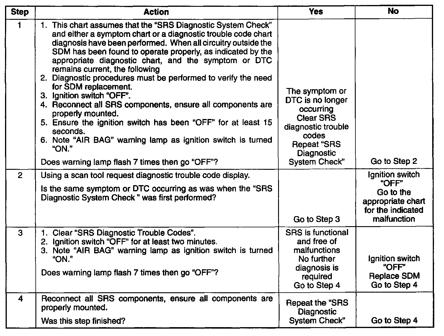 1. This test confirms a current malfunction. If no current malfunction is occurring (history DTC set) the "Diagnostic Aids" for the appropriate diagnostic trouble code should be referenced. The SDM should not be replaced for a history diagnostic trouble code.