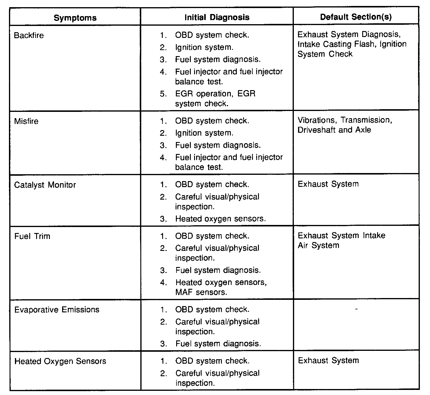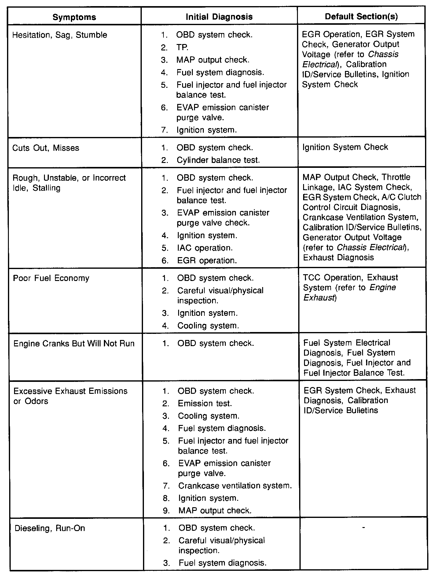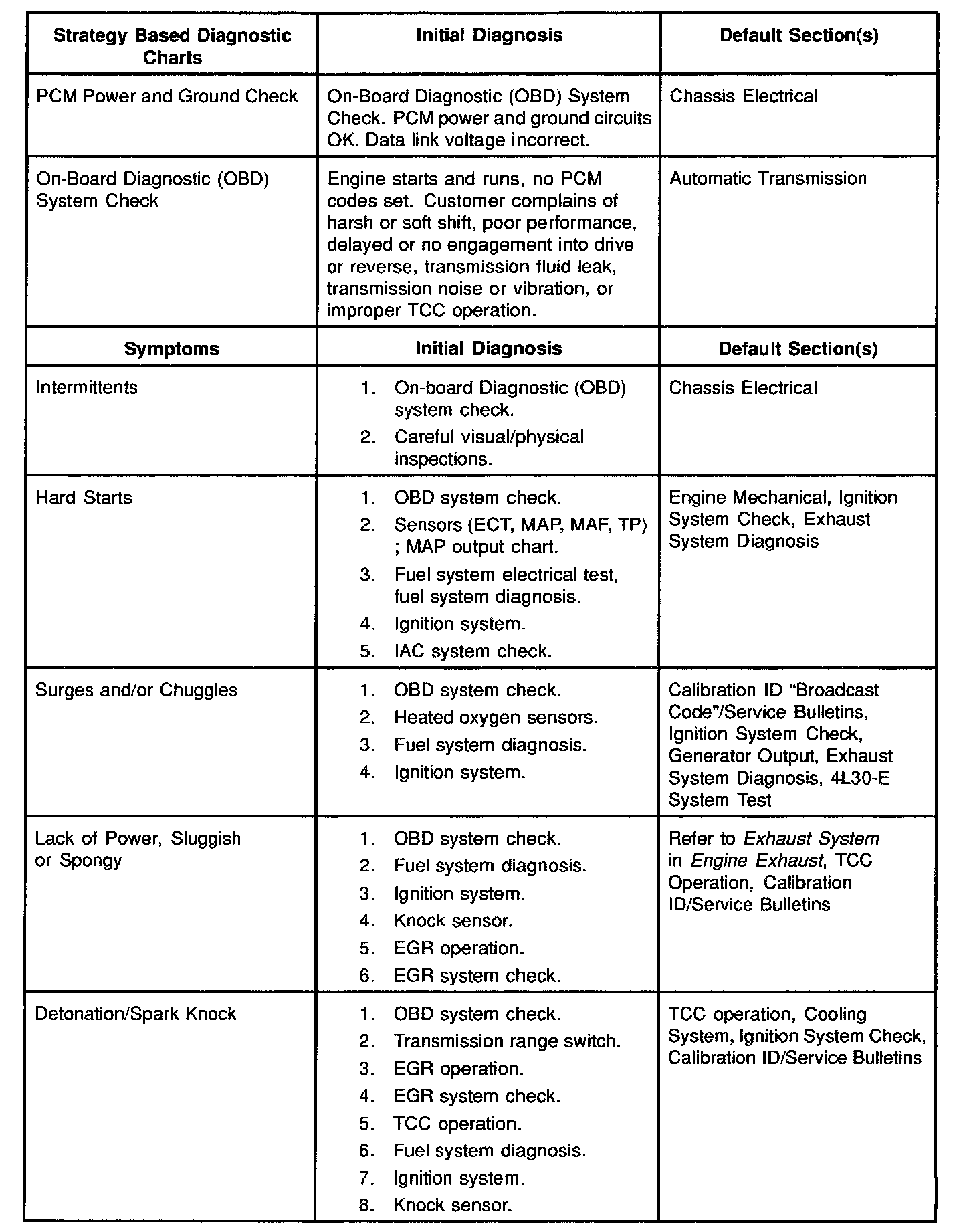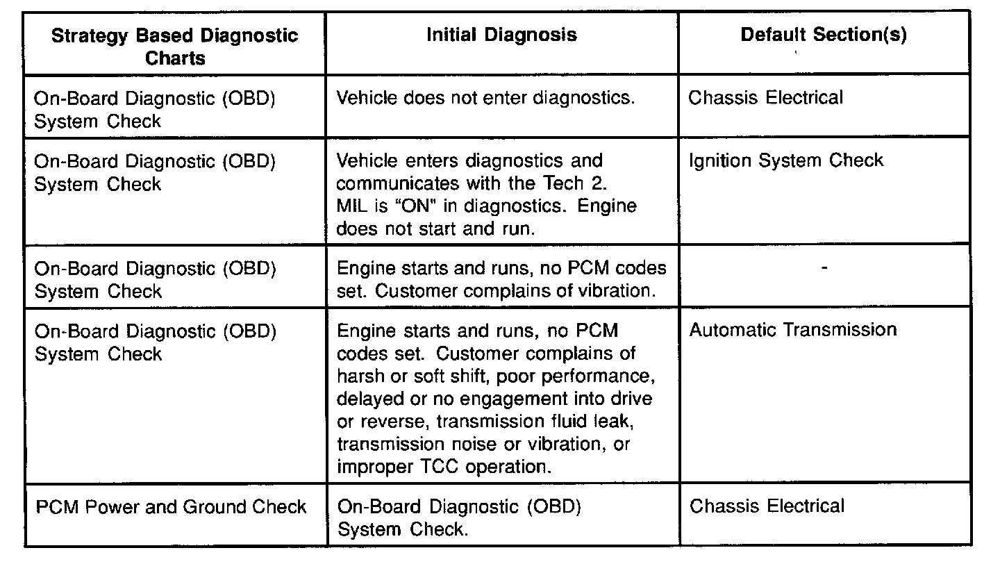 Service Procedure Default StrategyA referral strategy has been established to assist the technician with additional information when the cause of the failure cannot be determined. If no problem is found after performing diagnostics, then refer to the default matrix table for further diagnostic information.