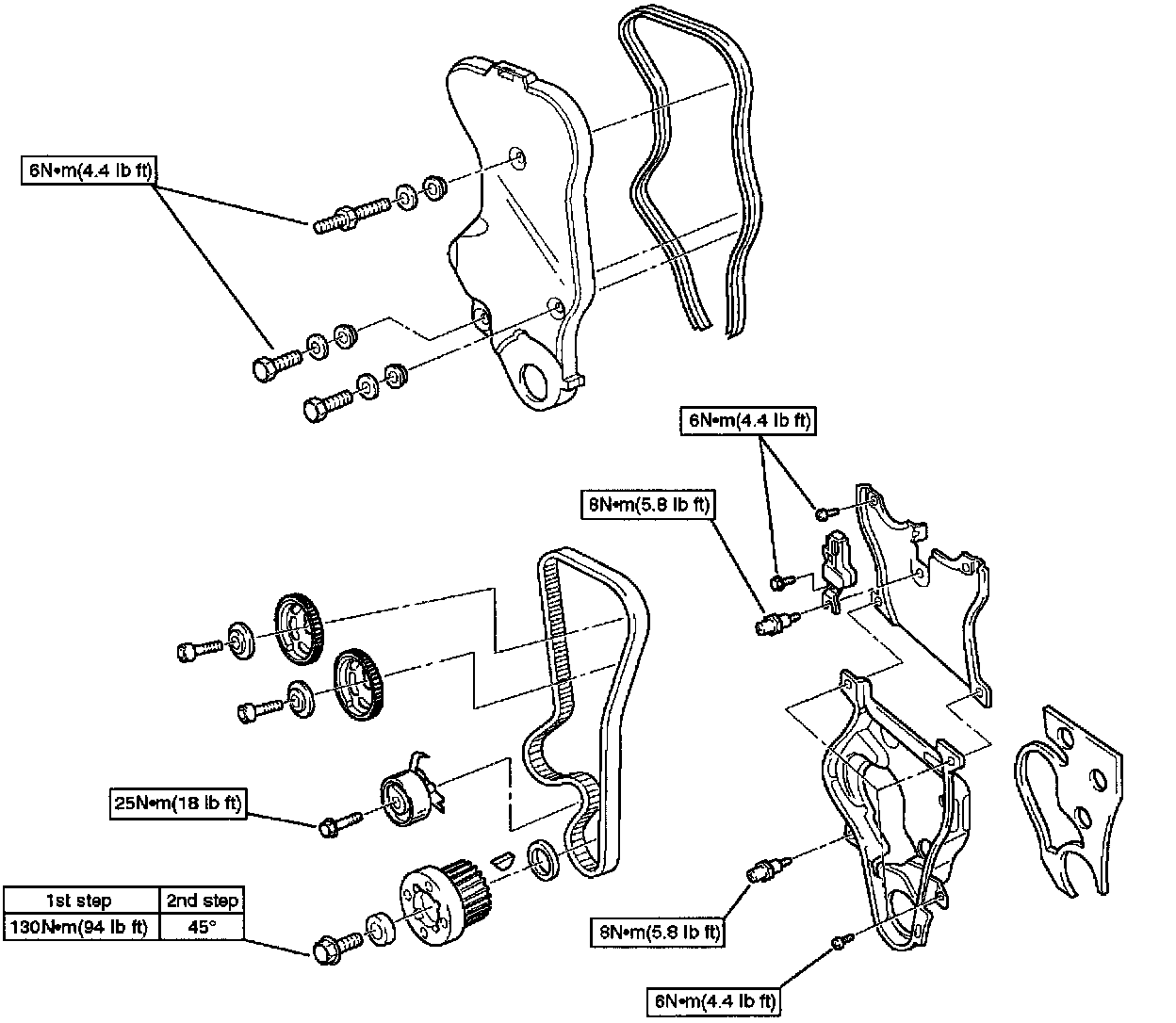 Timing gear crankshaft (center bolt), Timing belt cover front, Timing belt cover rear, Timing belt tensioner, Camshaft angle sensor