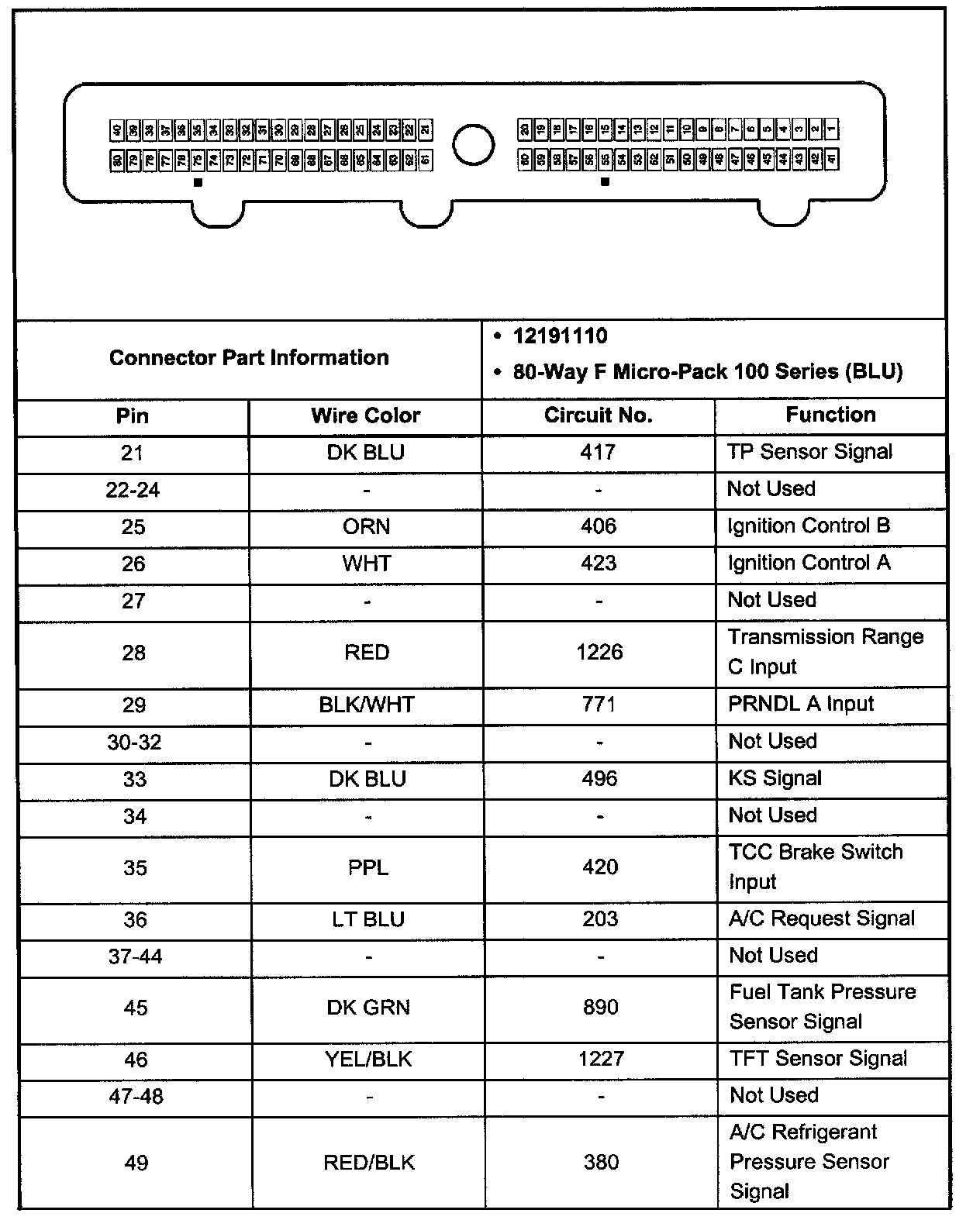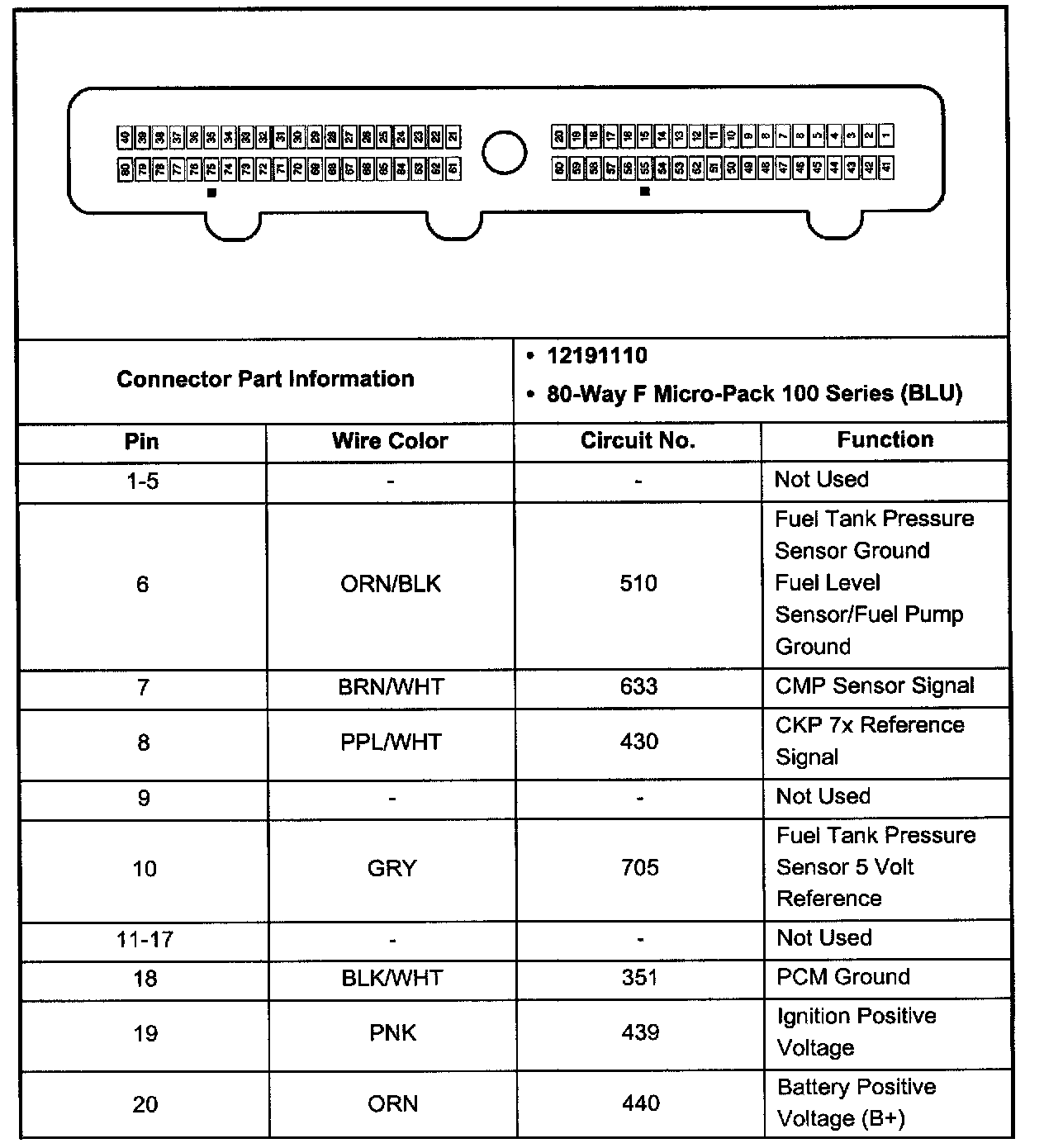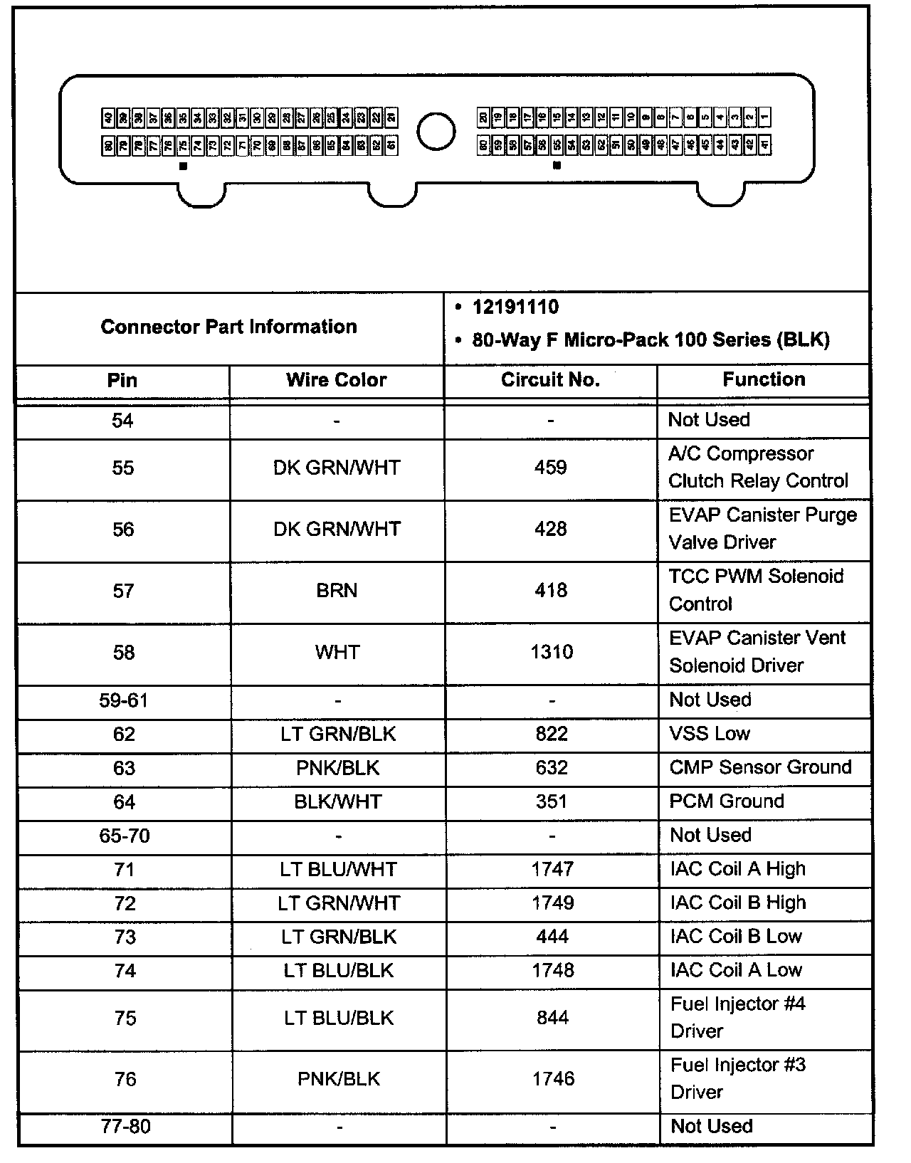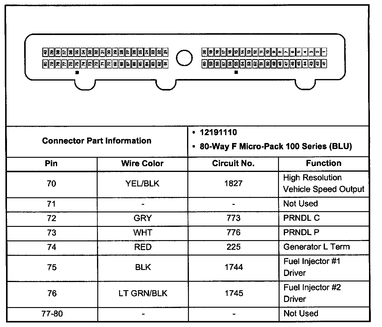 Powertrain Control Module (PCM) Connector C1 (Pin 70 - 80):