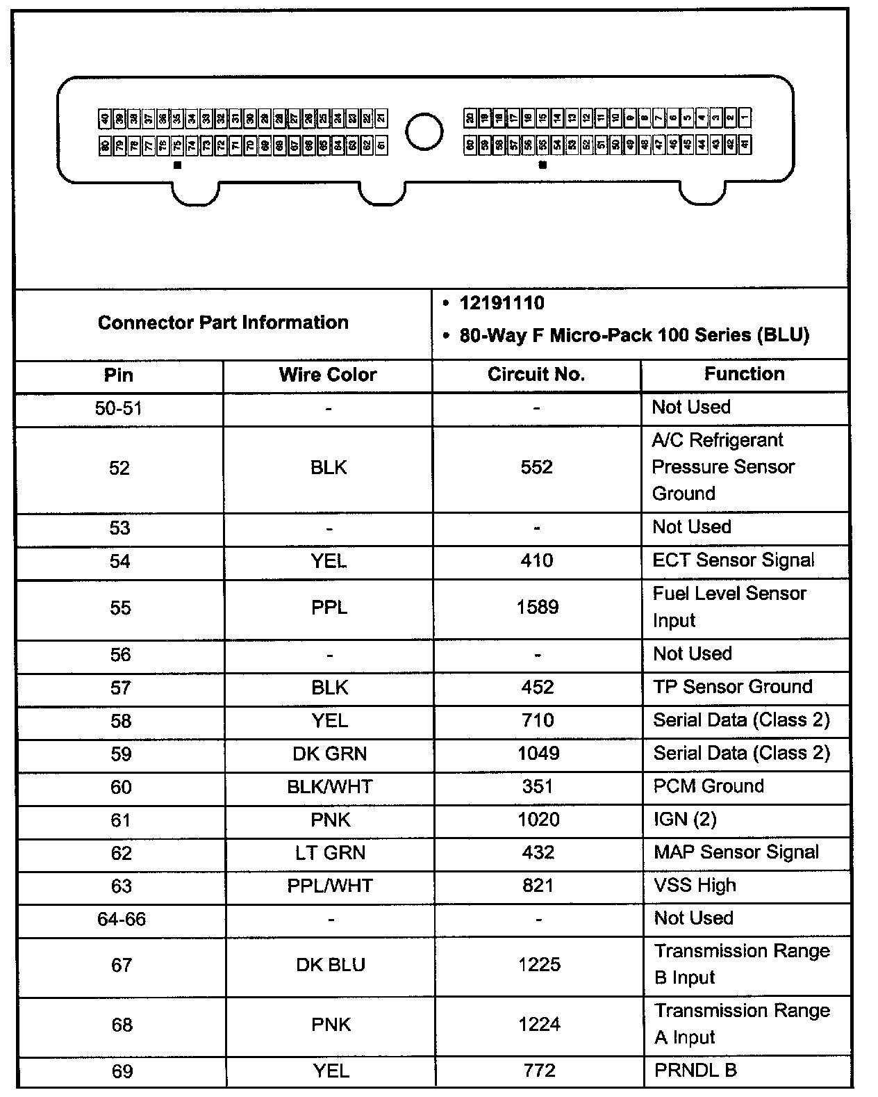 Powertrain Control Module (PCM) Connector C1 (Pin 50 - 69):