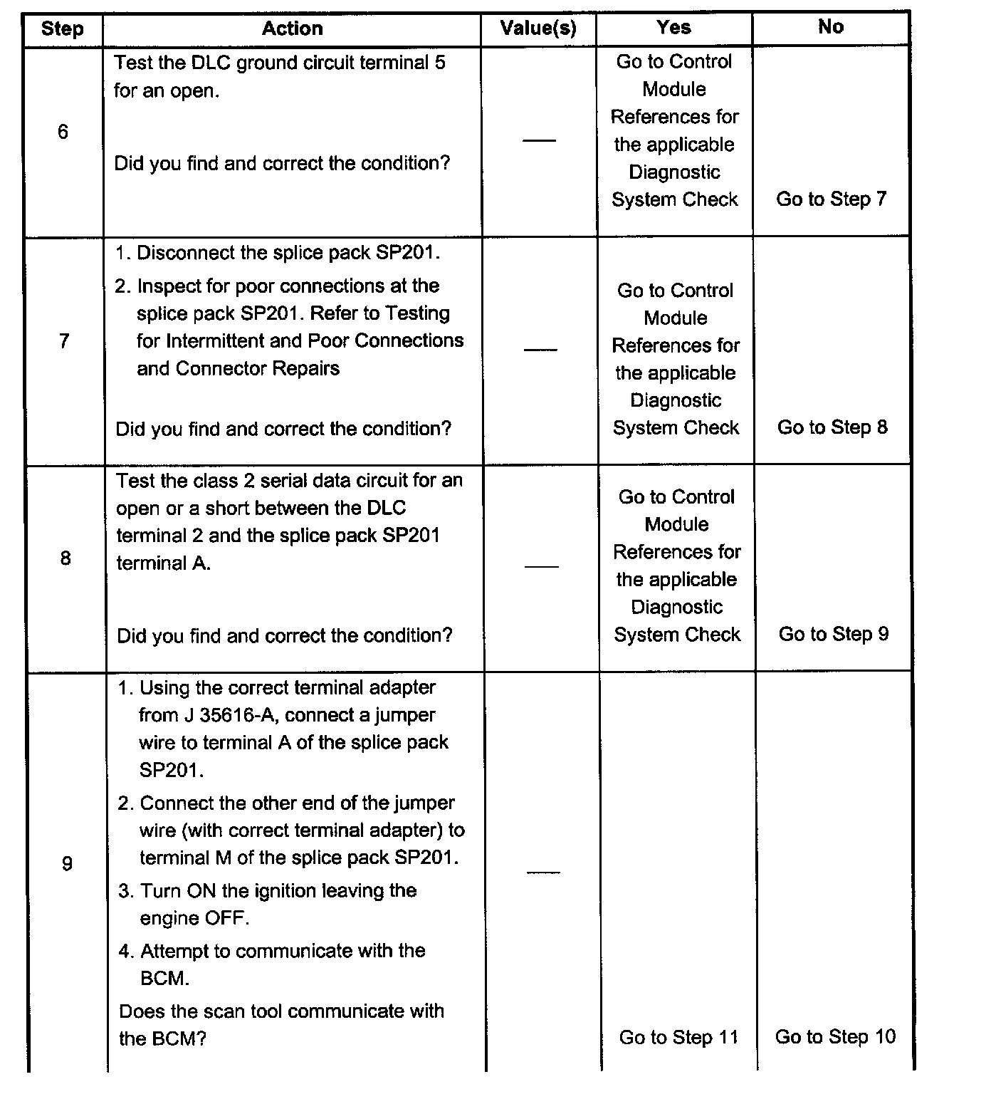 8. An open in the class 2 serial data circuit between the DLC and splice pack SP2O1 will prevent the scan tool from communicating with the module. This condition will not set a DTC.
