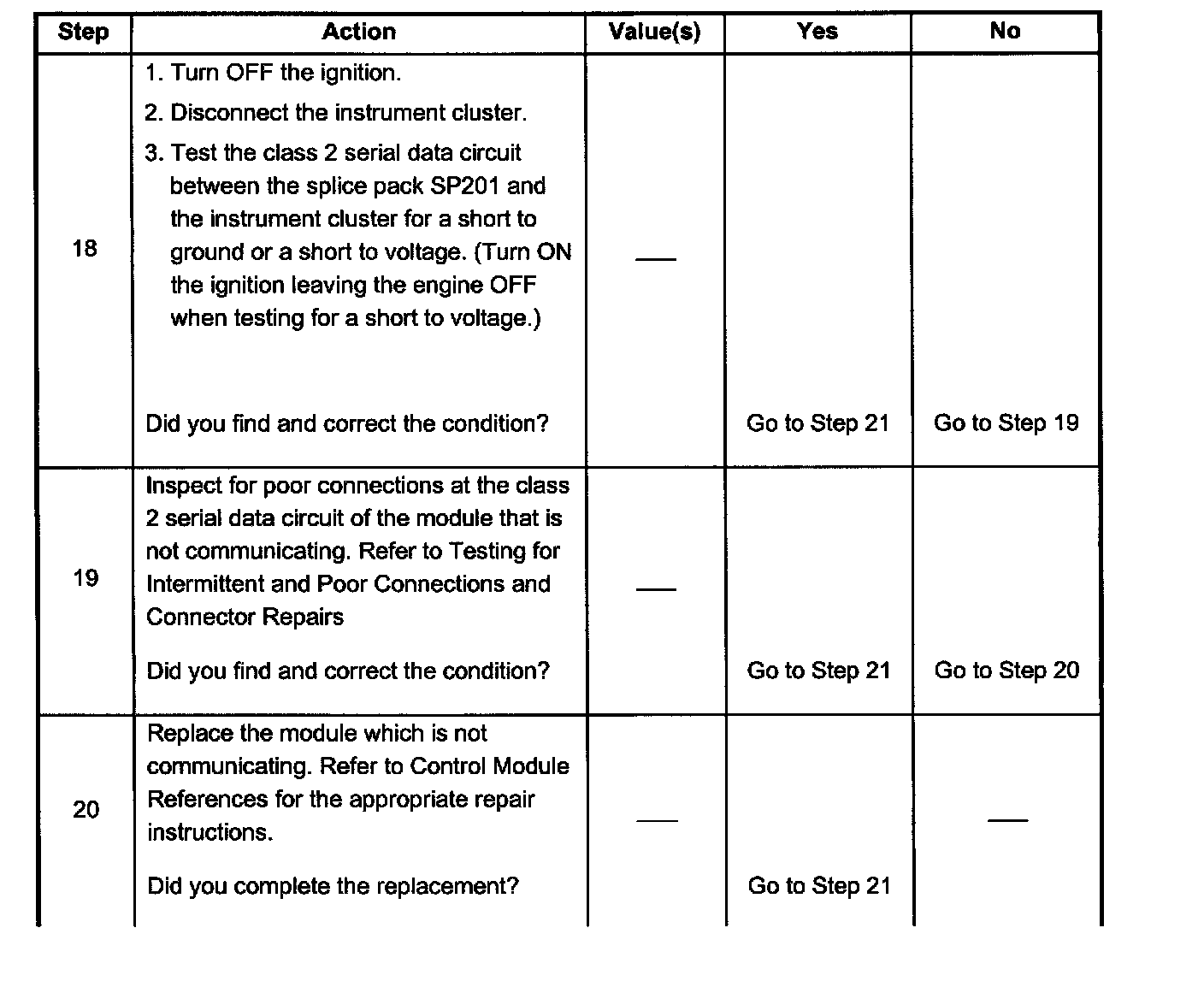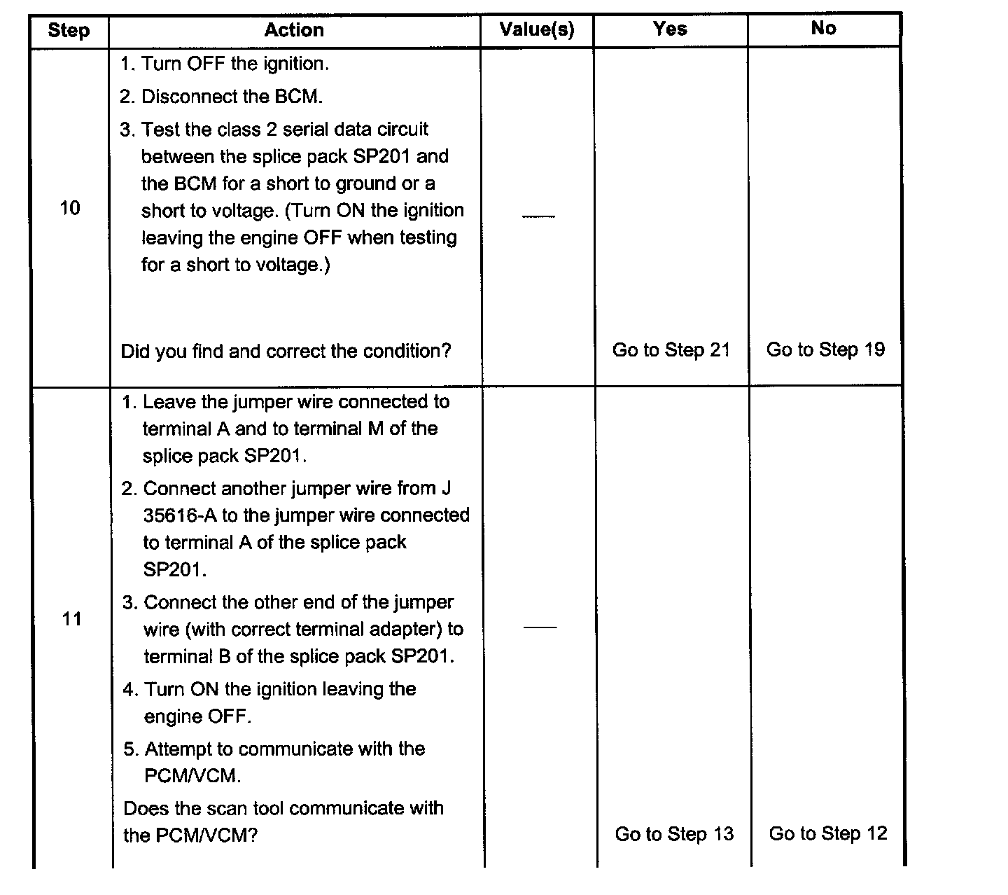 9. The class 2 serial data circuit is shorted to voltage or ground. The condition may be due to the wiring or due to a malfunction in one of the modules. When testing the wire for a short, ensure that there is not a module connected to the wire being tested. This test isolates the BCM class 2 serial data circuit.