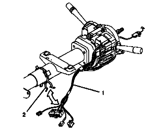 2. Remove the wire harness assembly (1) from the wire harness strap (2) and the steering column.