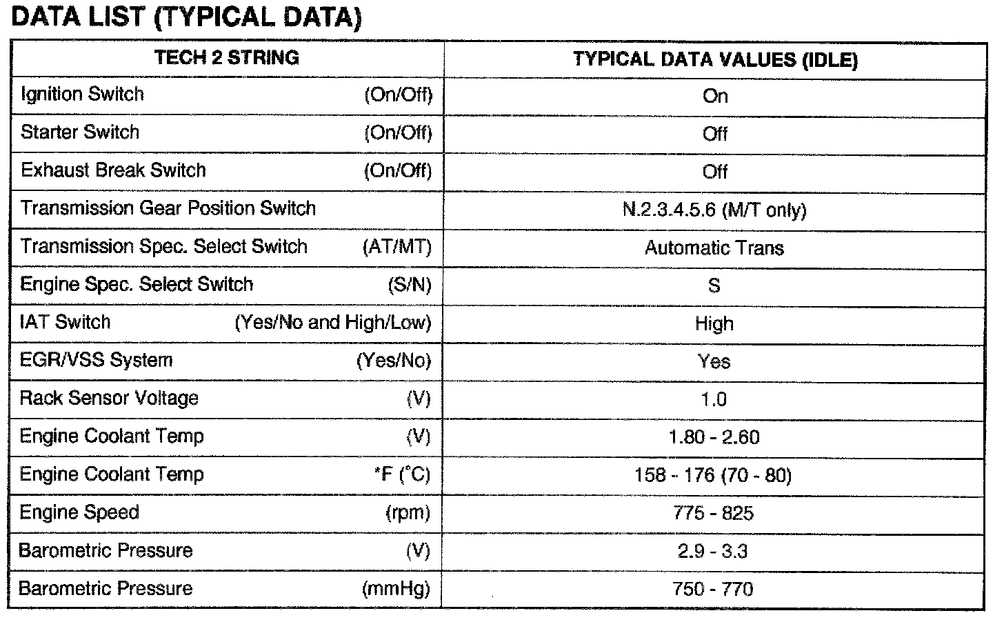 Use the Typical Scan Data Values Table only after the On-Board Diagnostic System Check has been completed, no diagnostic trouble codes were noted, and you have determined that the on-board diagnostics are functioning properly. Scan tool values from a properly-running engine may be used for comparison with the engine you are diagnosing. The typical scan data values represent values that would be seen on a normally-running engine.