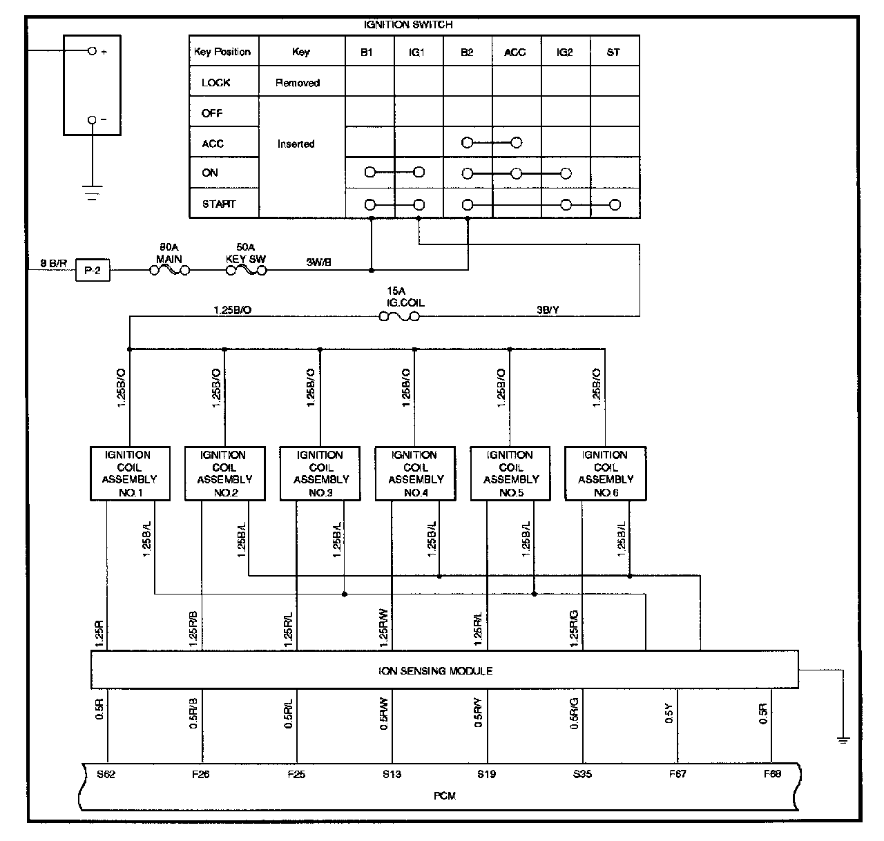 The EI consists of six ignition coils,ignition control module, crank angle sensor, powertrain control module (PCM) and other components.