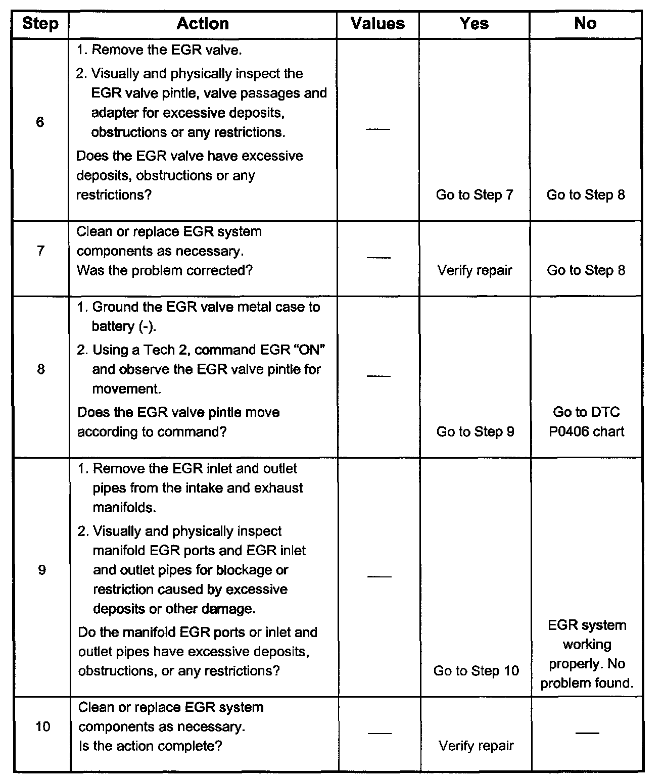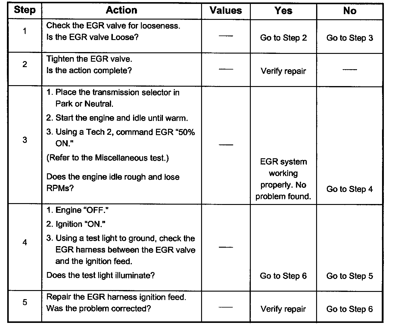 The EGR valve chart is a check of the EGR system. An EGR pintle constantly in the closed position could cause detonation and high emissions of NOx. It could also result in high long term fuel trim values in the open throttle cell, but not in the closed throttle cell. An EGR pintle constantly in the open position would cause a rough idle. Also, an EGR mounted incorrectly (rotated 180 °) could cause rough idle. Check for the following items: