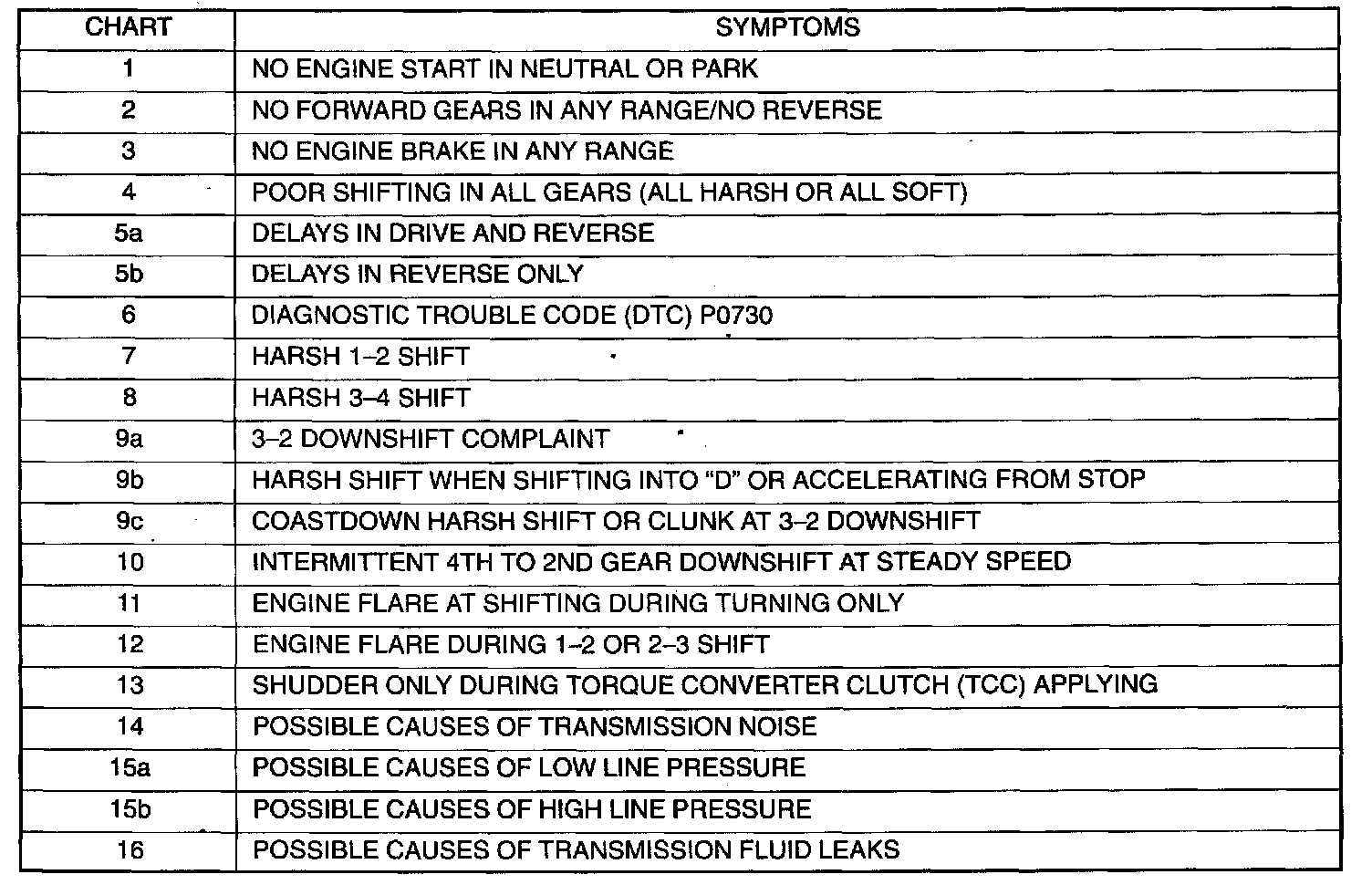 CHART 4: POOR SHIFTING IN ALL GEARS (ALL HARSH OR ALL SOFT)