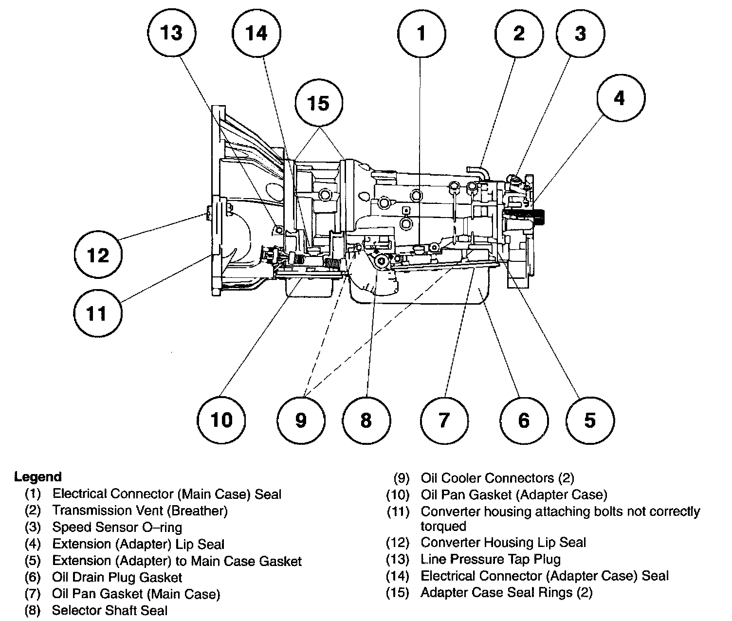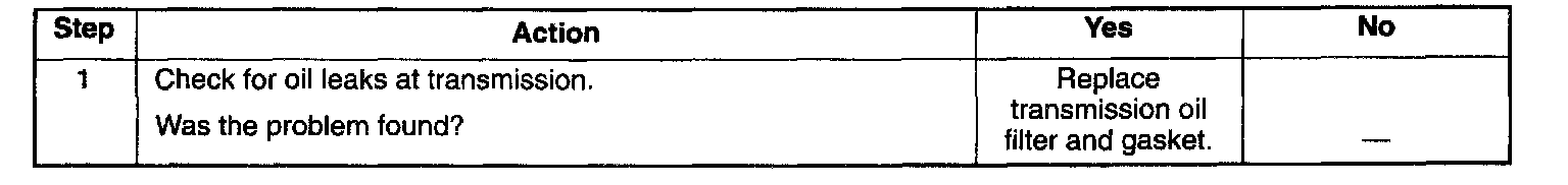 2. With the engine off, check for oil leaks due to the raised oil level caused by drainback of converter oil into the transmission.