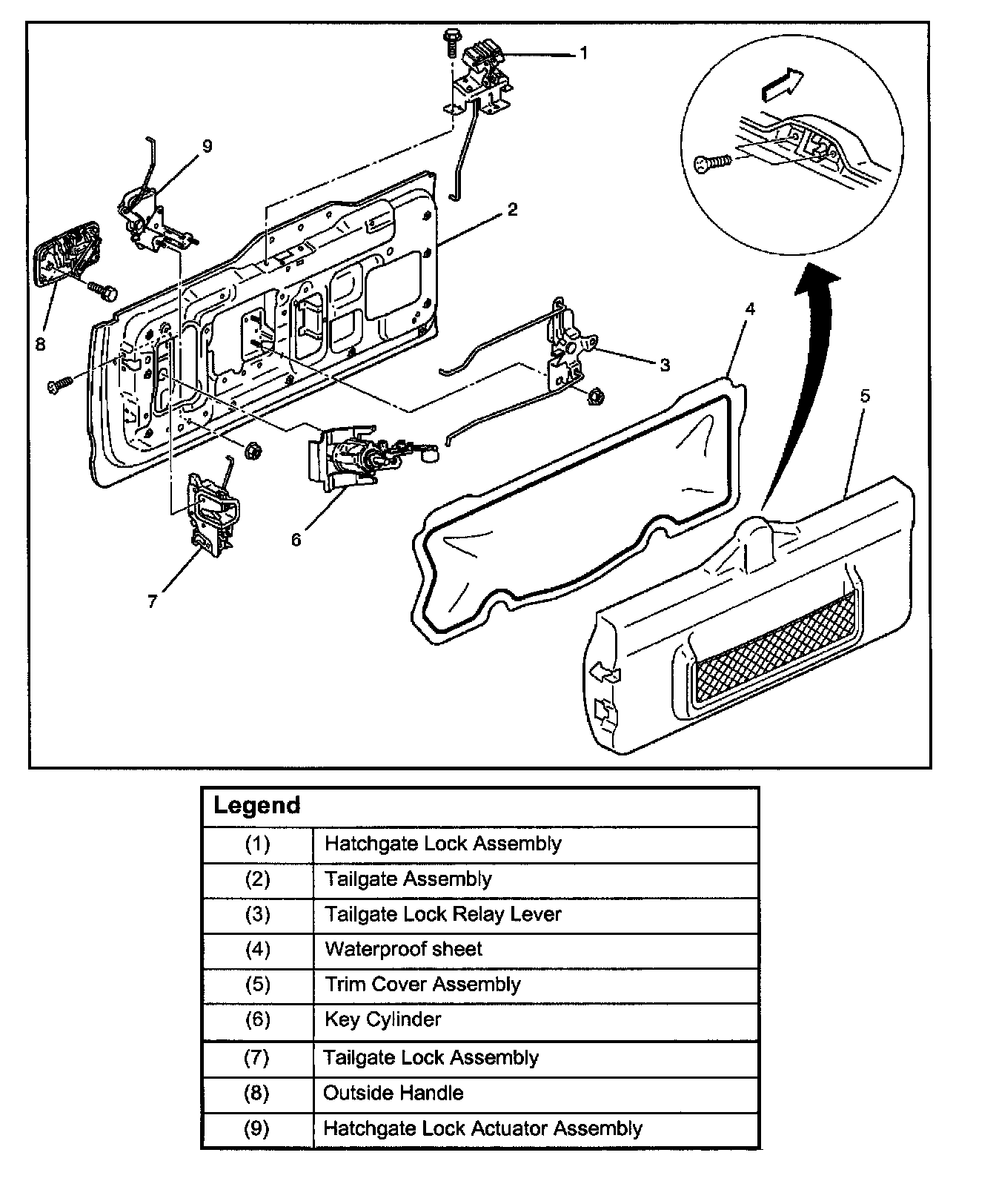 - Remove the 2 screws (2) holding the hatchgate lock assembly (1) first and pull up the trim cover while detaching the clips from tailgate panel.
