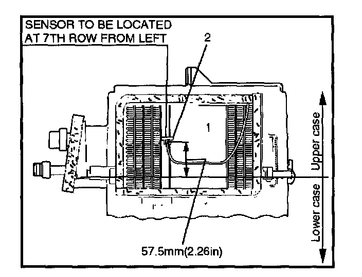 3. When installing the new evaporator core, install the duct sensor (2) to the evaporator core (1) specified position with the clip in the illustration.