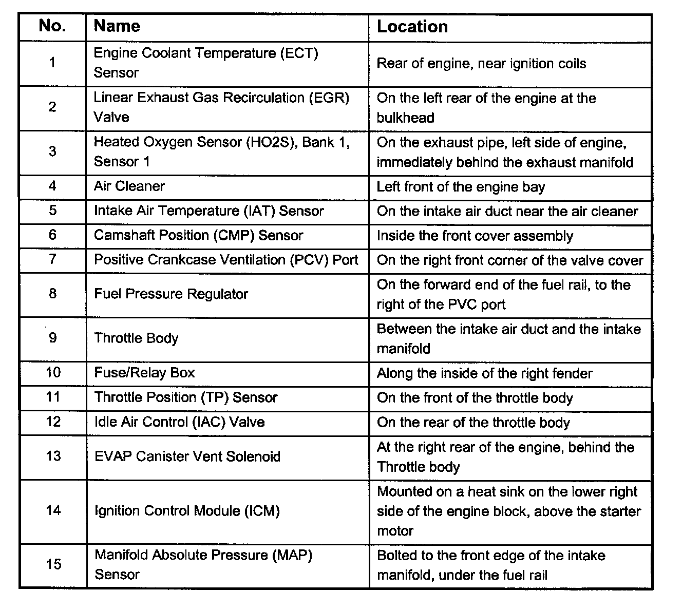 Engine Component Locator Table: