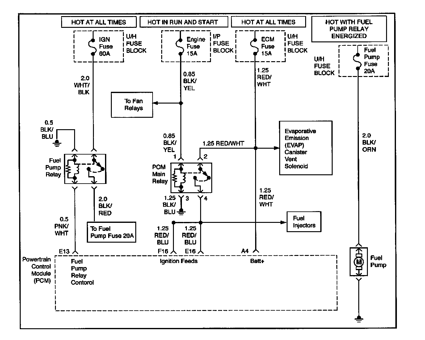 When the ignition switch is first turned ON, the powertrain control module (PCM) energizes the fuel pump relay which applies power to the in-tank fuel pump. The fuel pump relay will remain ON as long as the engine is running or cranking and the PCM is receiving 58X crankshaft position pulses. If no 58X crankshaft position pulses are present, the PCM de-energizes the fuel pump relay within 2 seconds after the ignition is turned ON or the engine is stopped.