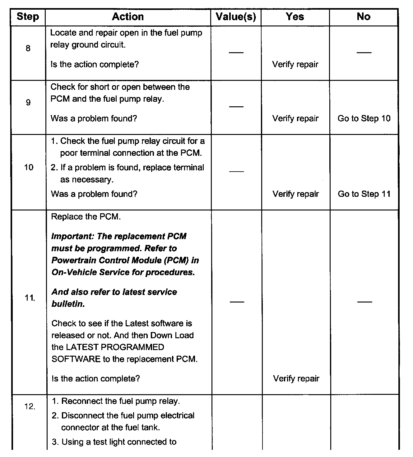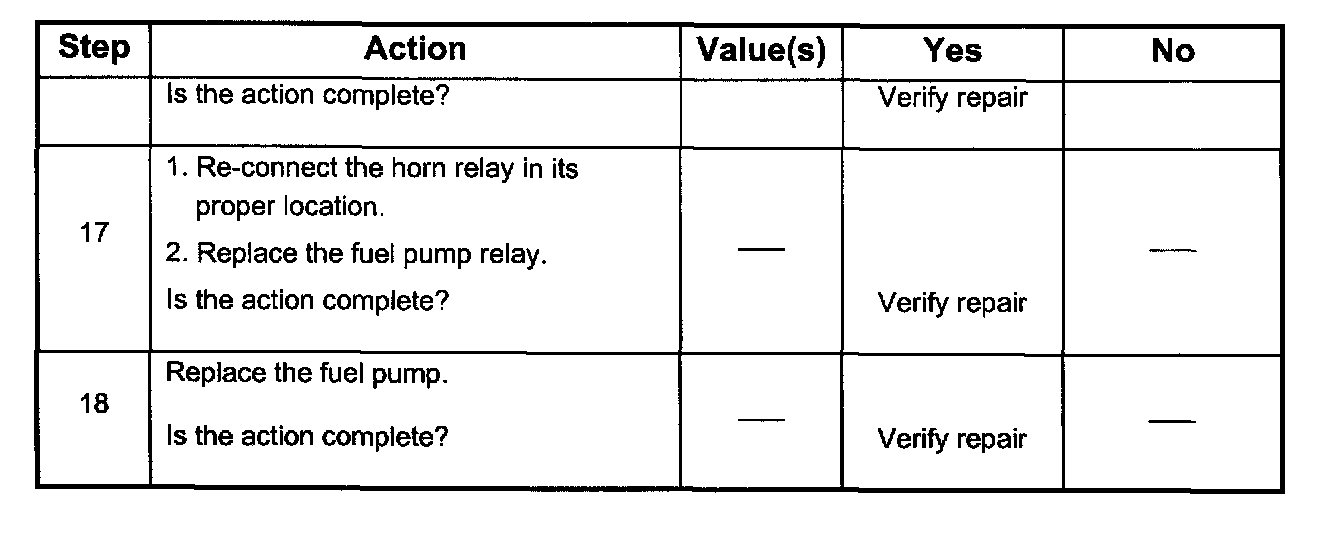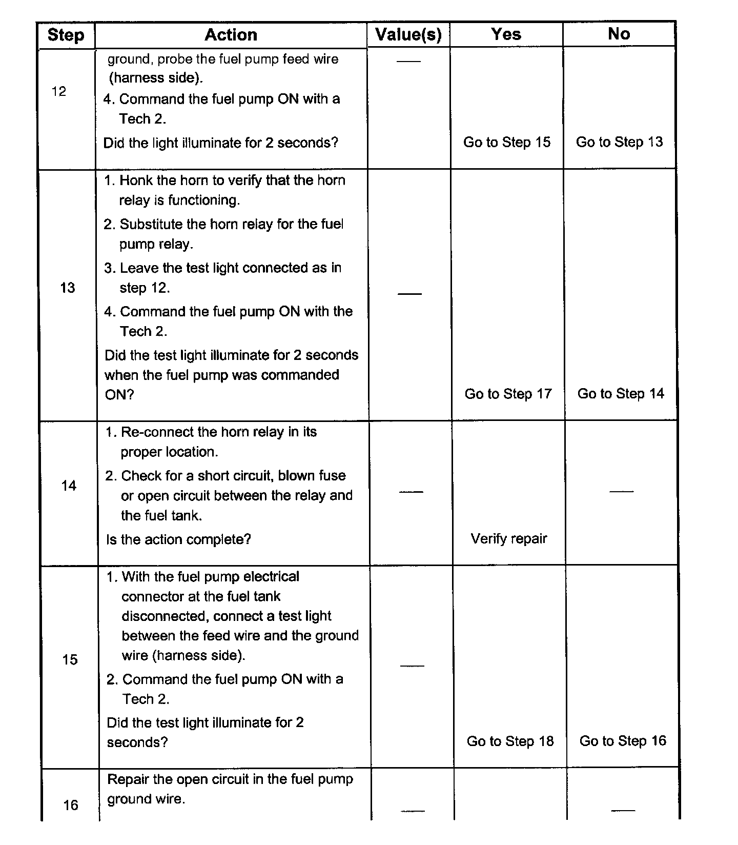 2. If the fuel pump is operating but incorrect pressure is noted, the fuel pump wiring is OK and the "Fuel System Pressure Test" chart should be used for diagnosis.