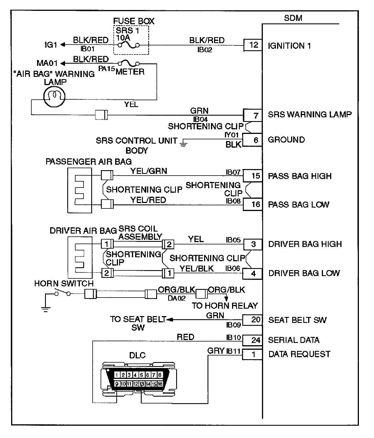 The SRS consists of the Sensing and Diagnostic Module (SDM), the driver air bag assembly, the SRS coil assembly, the passenger air bag assembly, and the "AIR BAG" warning lamp in the instrument cluster. The SDM, SRS coil assembly (driver side only), driver air bag assembly, passenger air bag assembly and connector wire make up the deployment loops. The function of the deployment loops is to supply current through air bag assembly, which will cause deployment of the air bags in the event of a frontal crash of sufficient force, up to 30 degrees off the centerline of the vehicle. The air bag assemblies are only supplied enough current to deploy when the SDM detects vehicle velocity changes severe enough to warrant deployment.