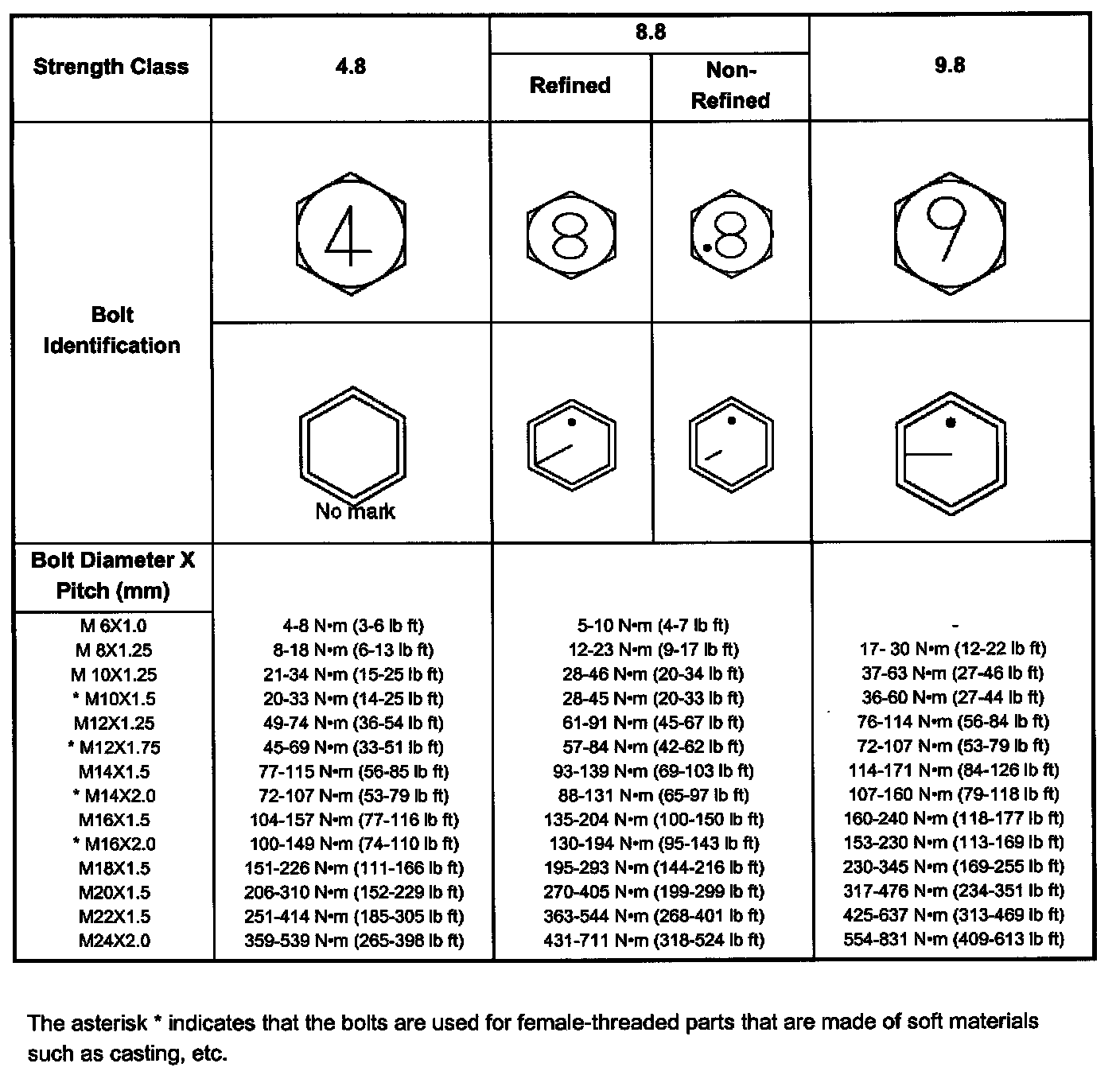 The torque values given in the following table should be applied where a particular torque is not specified.