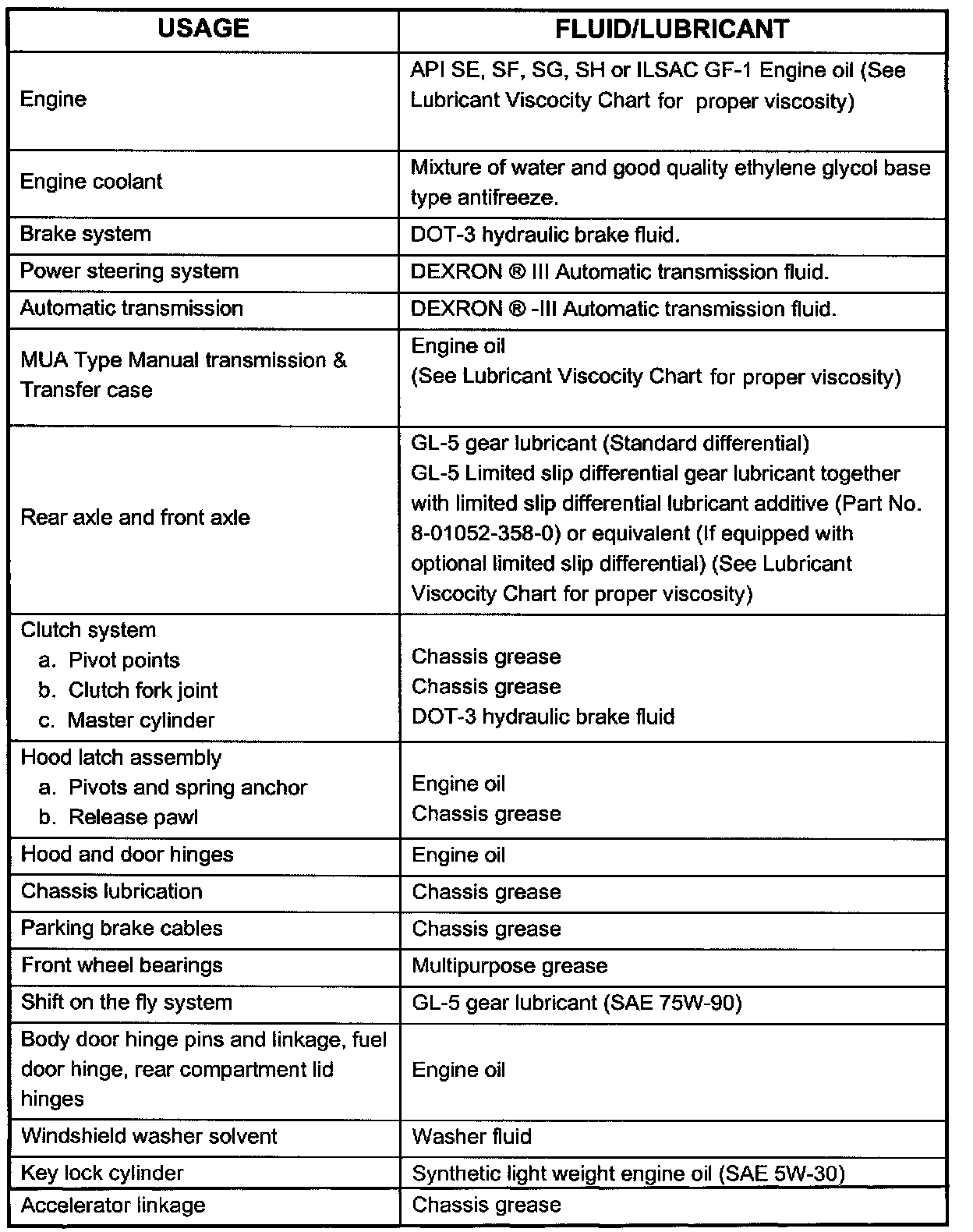 Recommended Fluids & Lubricants: