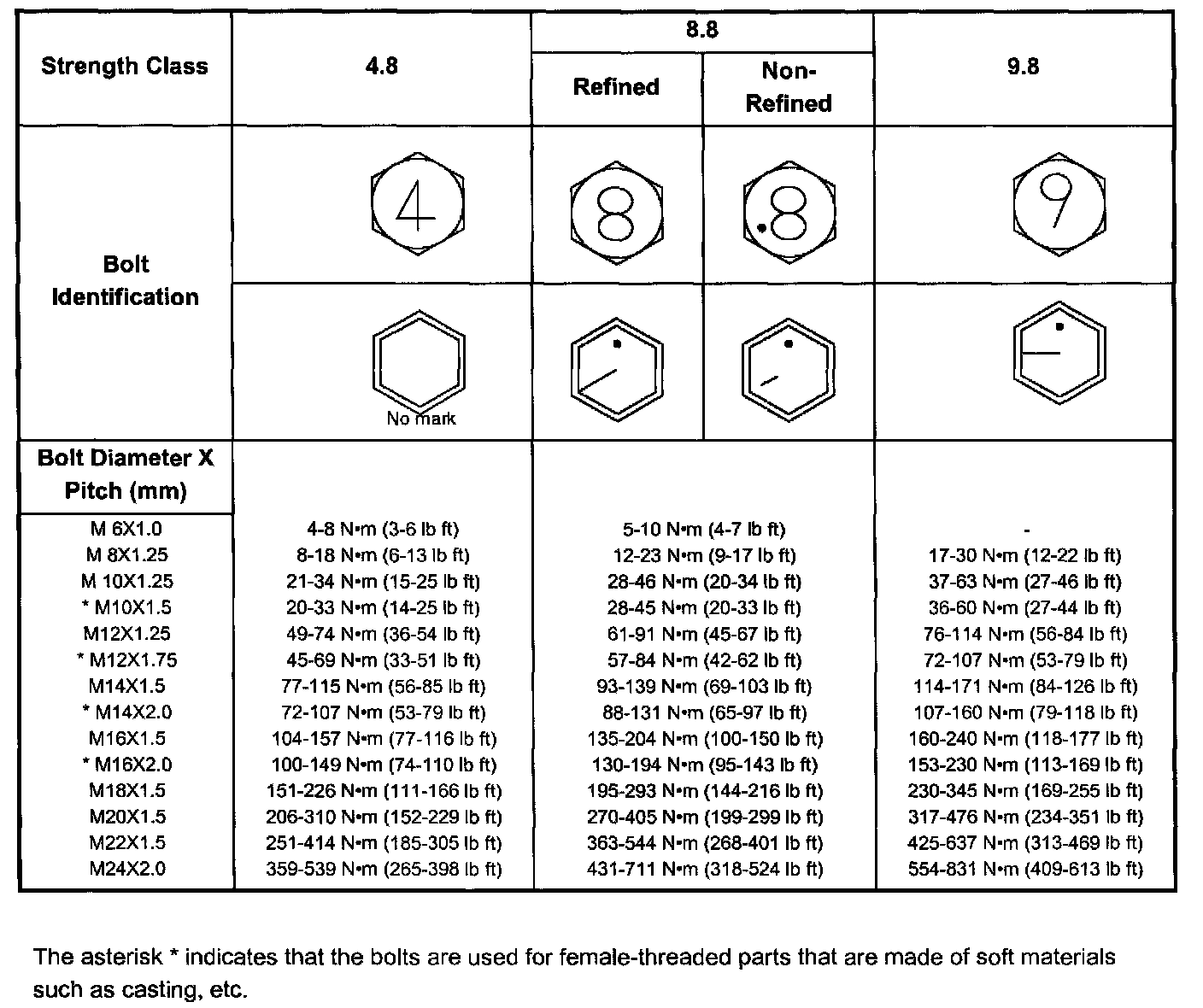The torque values given in the following table should be applied where a particular torque is not specified.