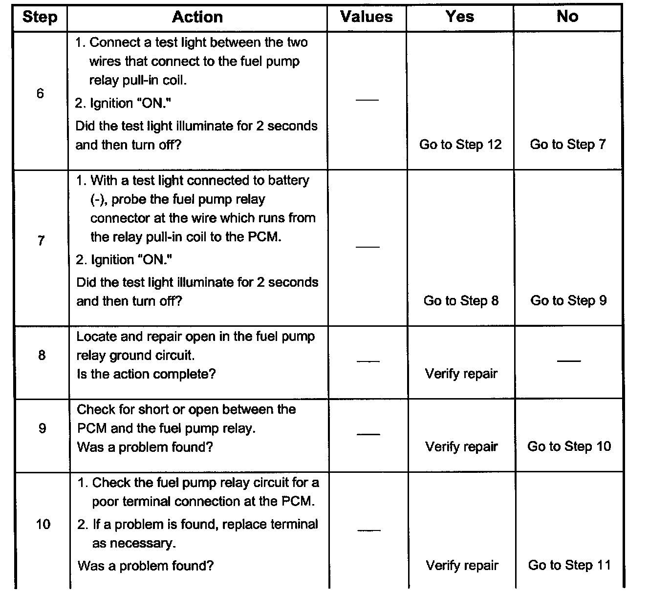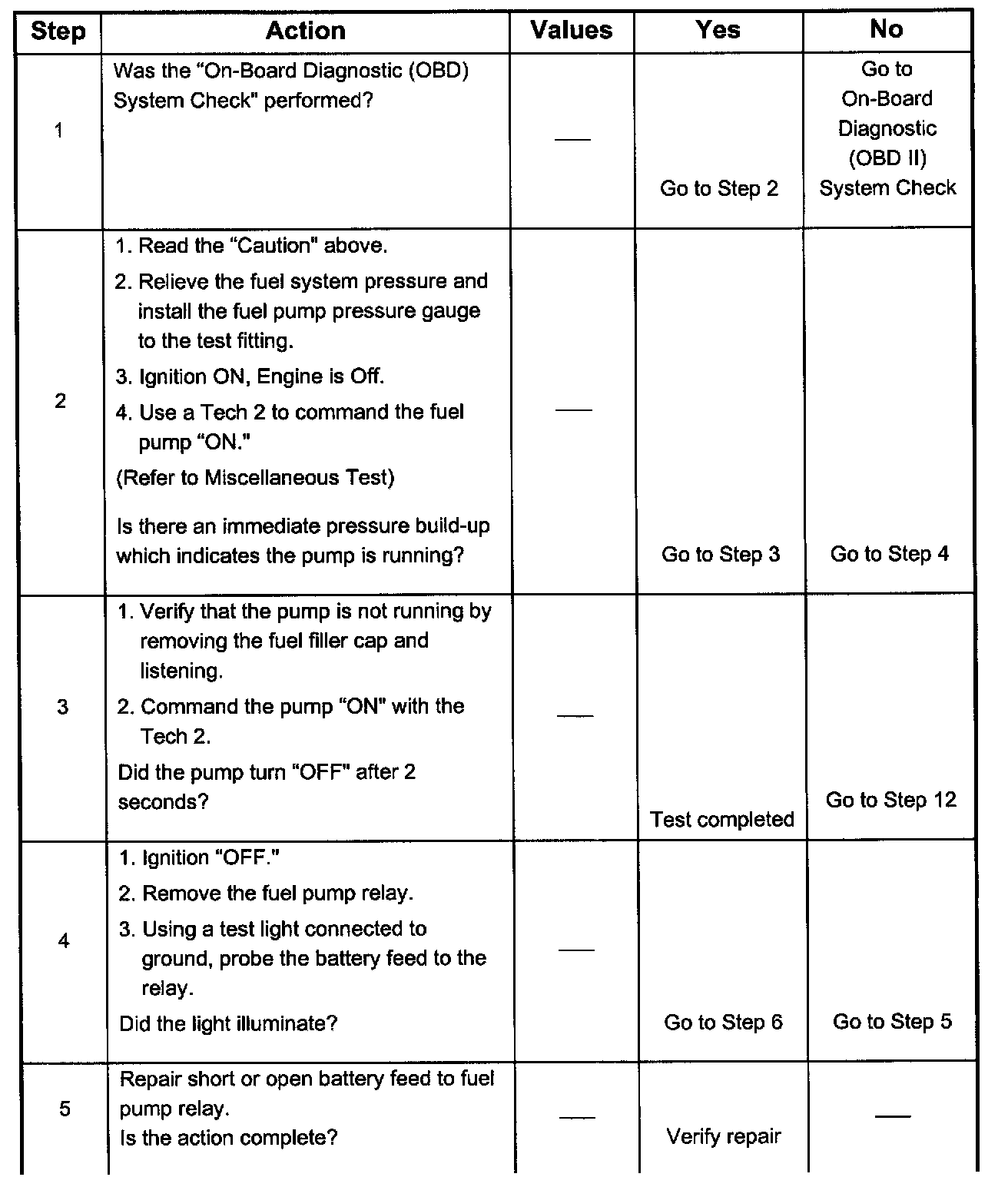 2. If the fuel pump is operating but incorrect pressure is noted, the fuel pump wiring is OK and the "Fuel System Pressure Test" chart should be used for diagnosis.