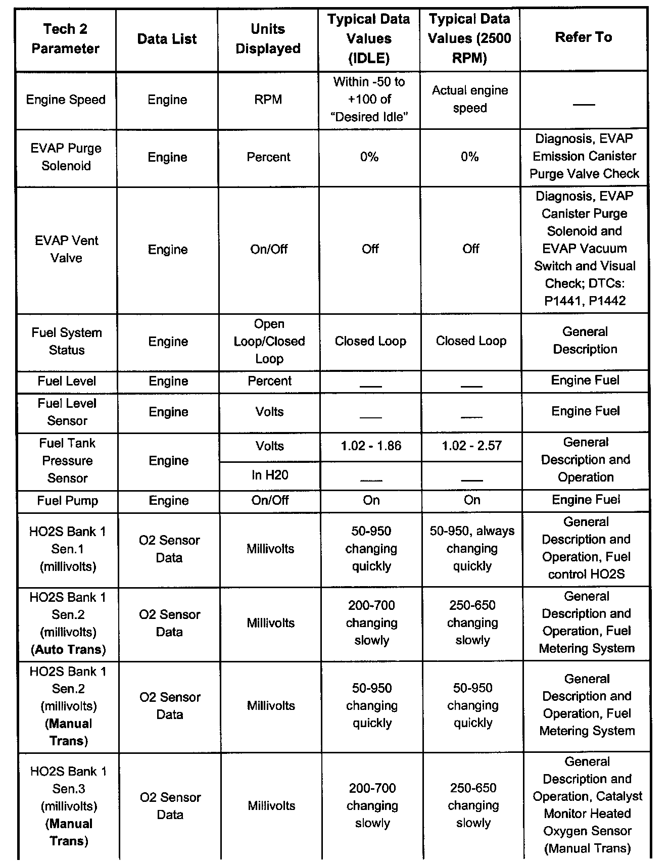 Only the parameters listed are referred for use in diagnosis. For further information on using the Tech 2 to diagnose the PCM and related sensors, refer to the applicable reference listed below. If all values are within the typical range described below, refer to Symptom Diagnosis for diagnosis.