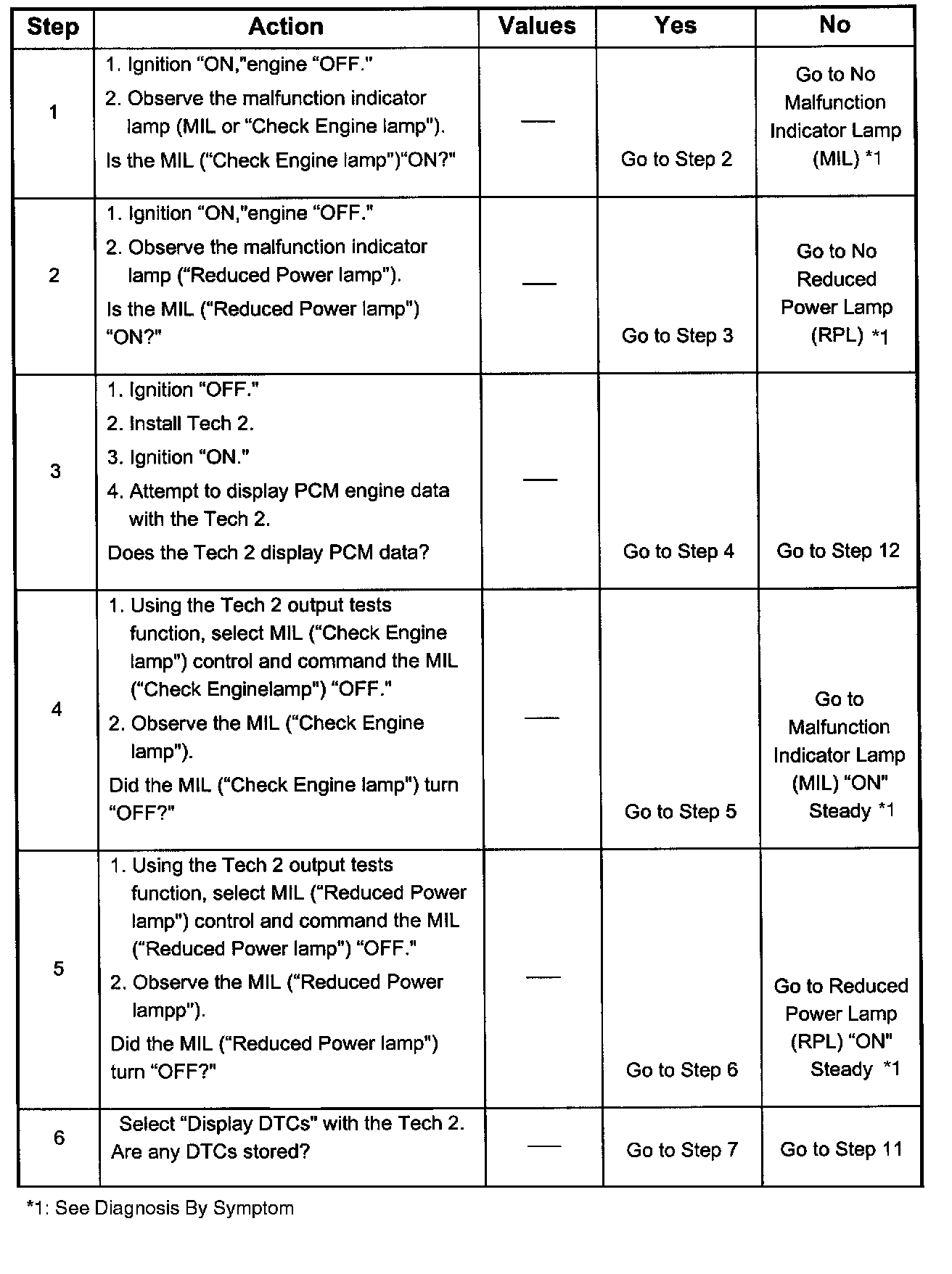 1. The MIL ("Check Engine lamp") should be ON steady with the ignition ON engine OFF. If not, the "No MIL" chart should be used to isolate the malfunction.