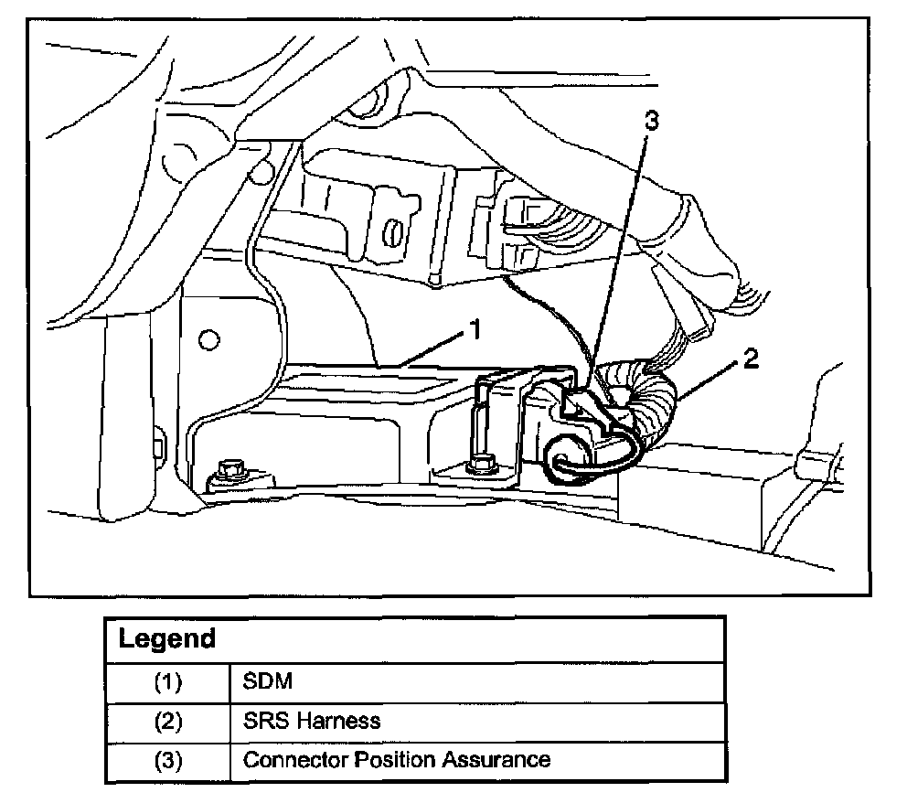 WARNING: DURING SERVICE PROCEDURES, BE VERY CAREFUL WHEN HANDLING A SENSING AND DIAGNOSTIC MODULE (SDM). NEVER STRIKE OR JAR THE SDM. NEVER POWER UP THE SRS WHEN THE SDM IS NOT RIGIDLY ATTACHED TO THE VEHICLE. ALL SDM AND MOUNTING BRACKET FASTENERS MUST BE CAREFULLY TORQUED AND THE ARROW MUST BE POINTED TOWARD THE FRONT OF THE VEHICLE TO ENSURE PROPER OPERATION OF THE SRS. THE SDM COULD BE ACTIVATED WHEN POWERED WHILE NOT RIGIDLY ATTACHED TO THE VEHICLE WHICH COULD CAUSE DEPLOYMENT AND RESULT IN PERSONAL INJURY.
