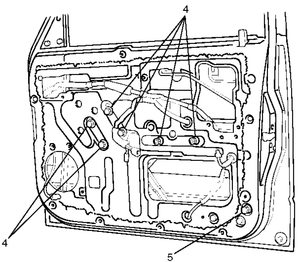 - Remove the window regulator fixing bolts (4) and the rear guide rail fixing bolt (5).