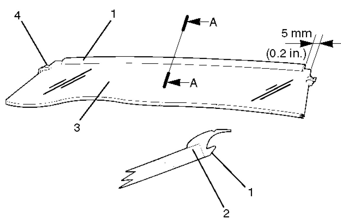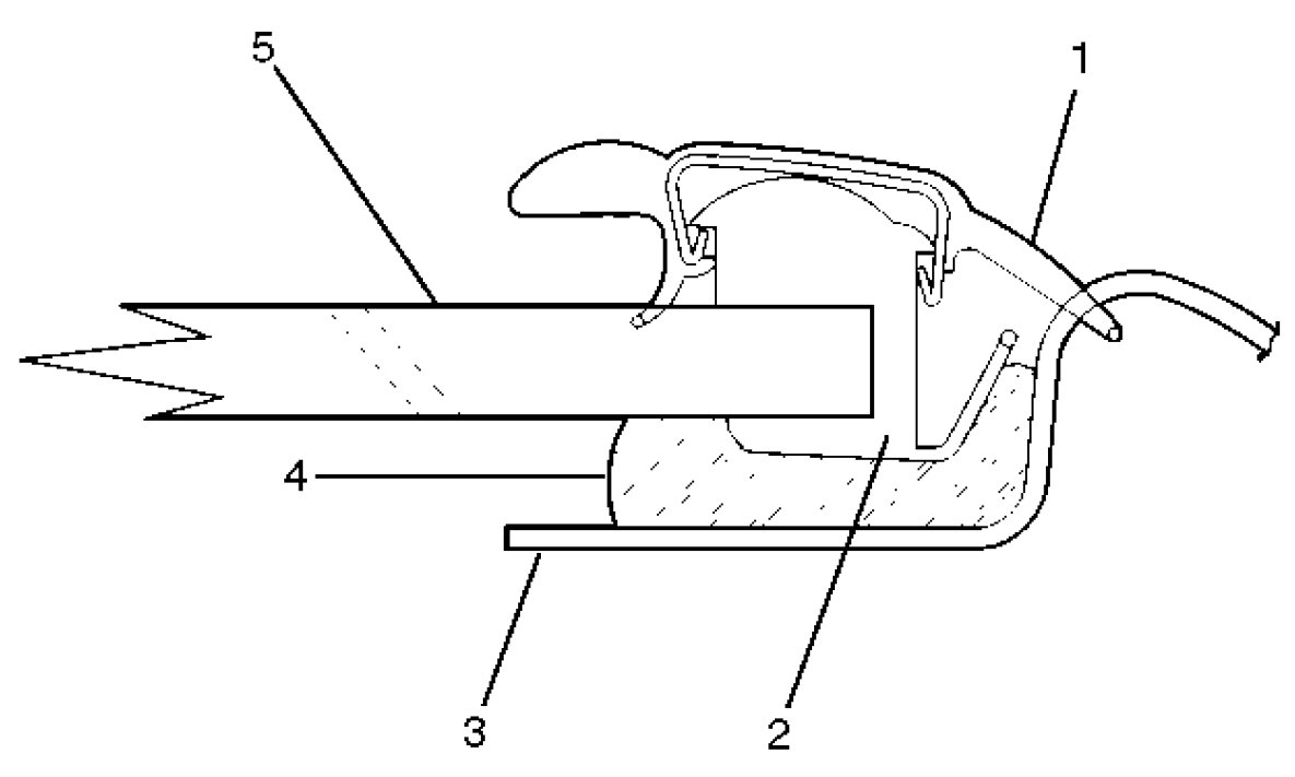 - Insert the windshield (5) side moulding (1) into the moulding clip (2).