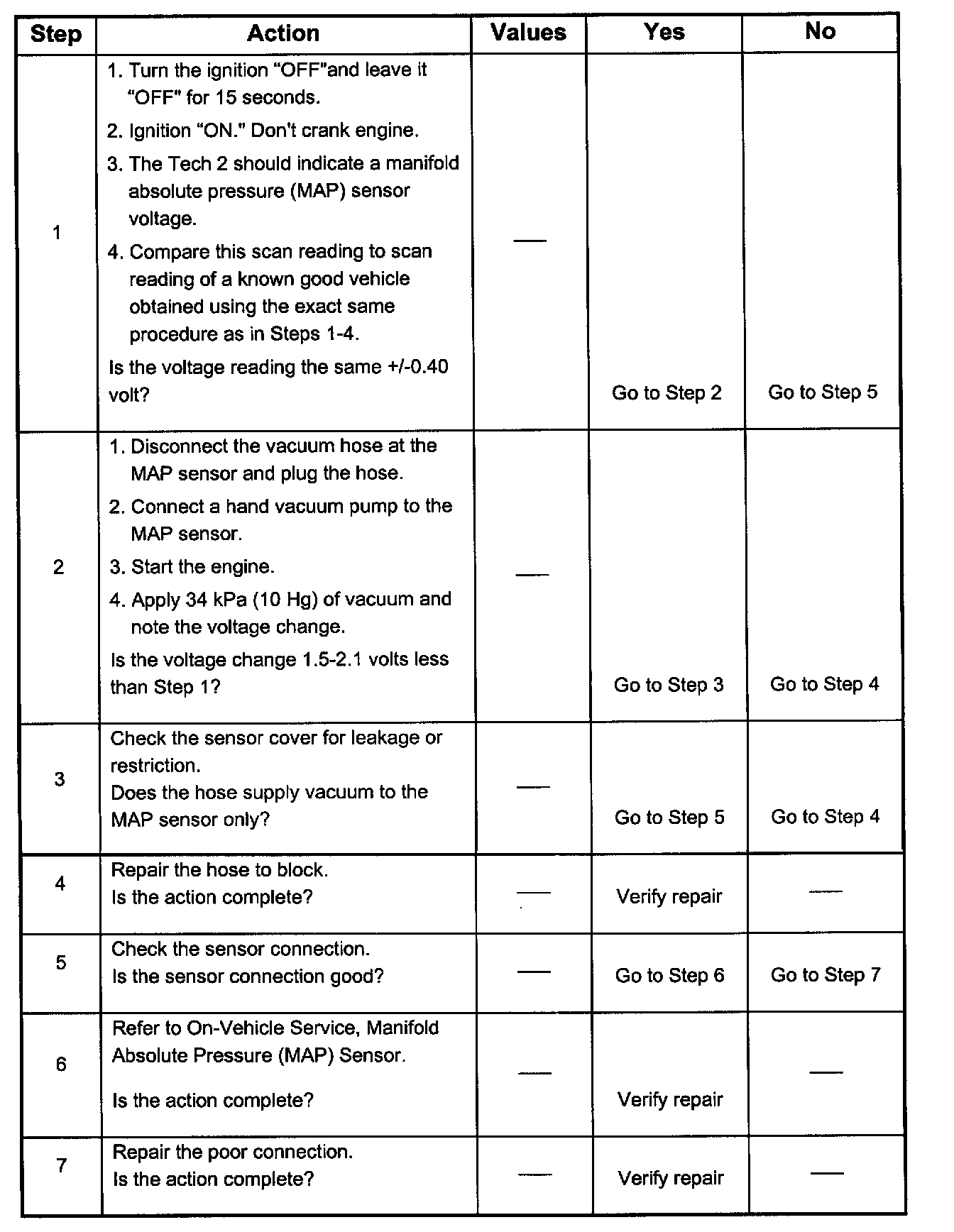 2. Applying 34 kPa (10 Hg) vacuum to the MAP sensor should cause the voltage to be 1.5 - 2.1 volts less than the voltage at step 1. Upon applying vacuum to the sensor, the change in voltage should be instantaneous. A slow voltage change indicates a faulty sensor.