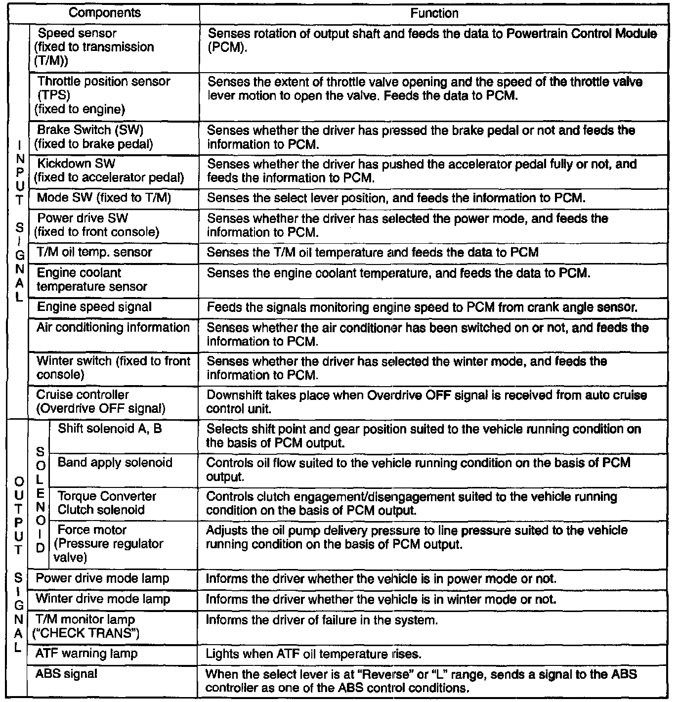 The transmission gear is shifted according to the shift pattern selected by the driver. In shifting gears. the gear ratio is controlled by the ON/OFF signal using the shift solenoid A and the shift solenoid B.