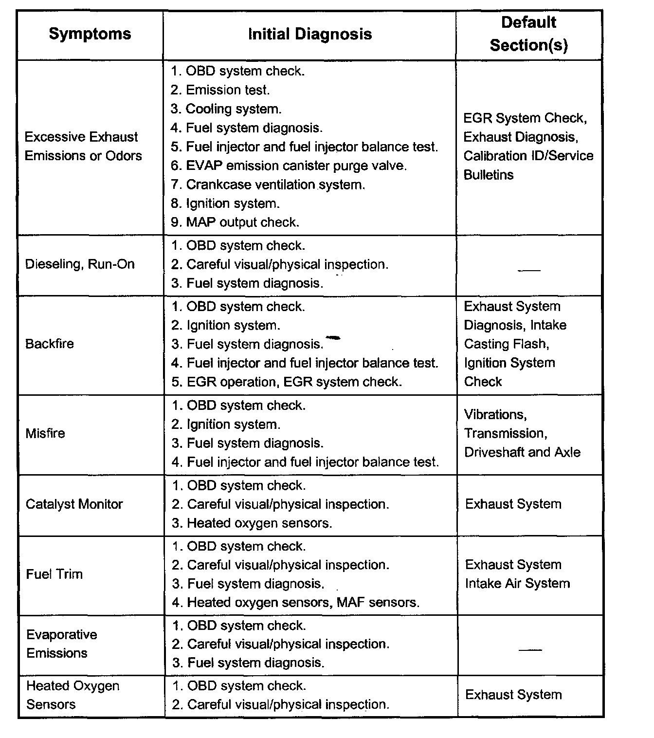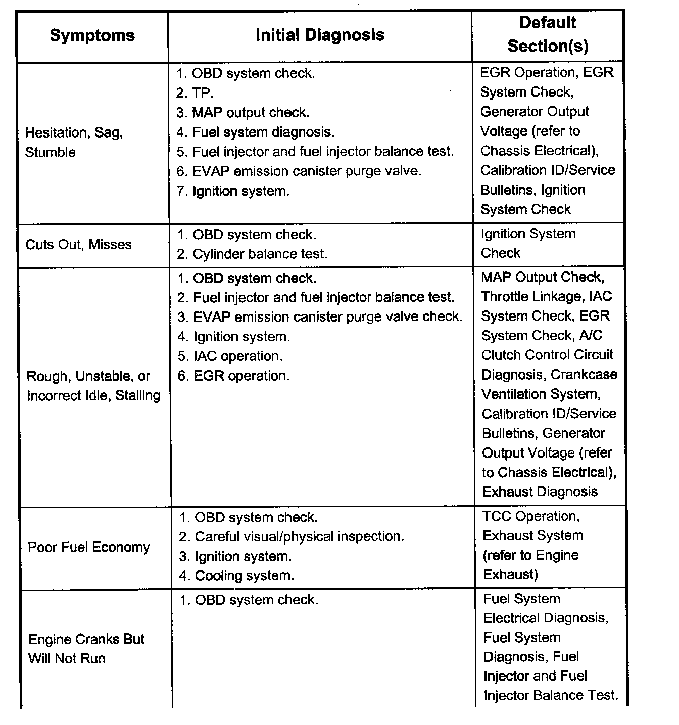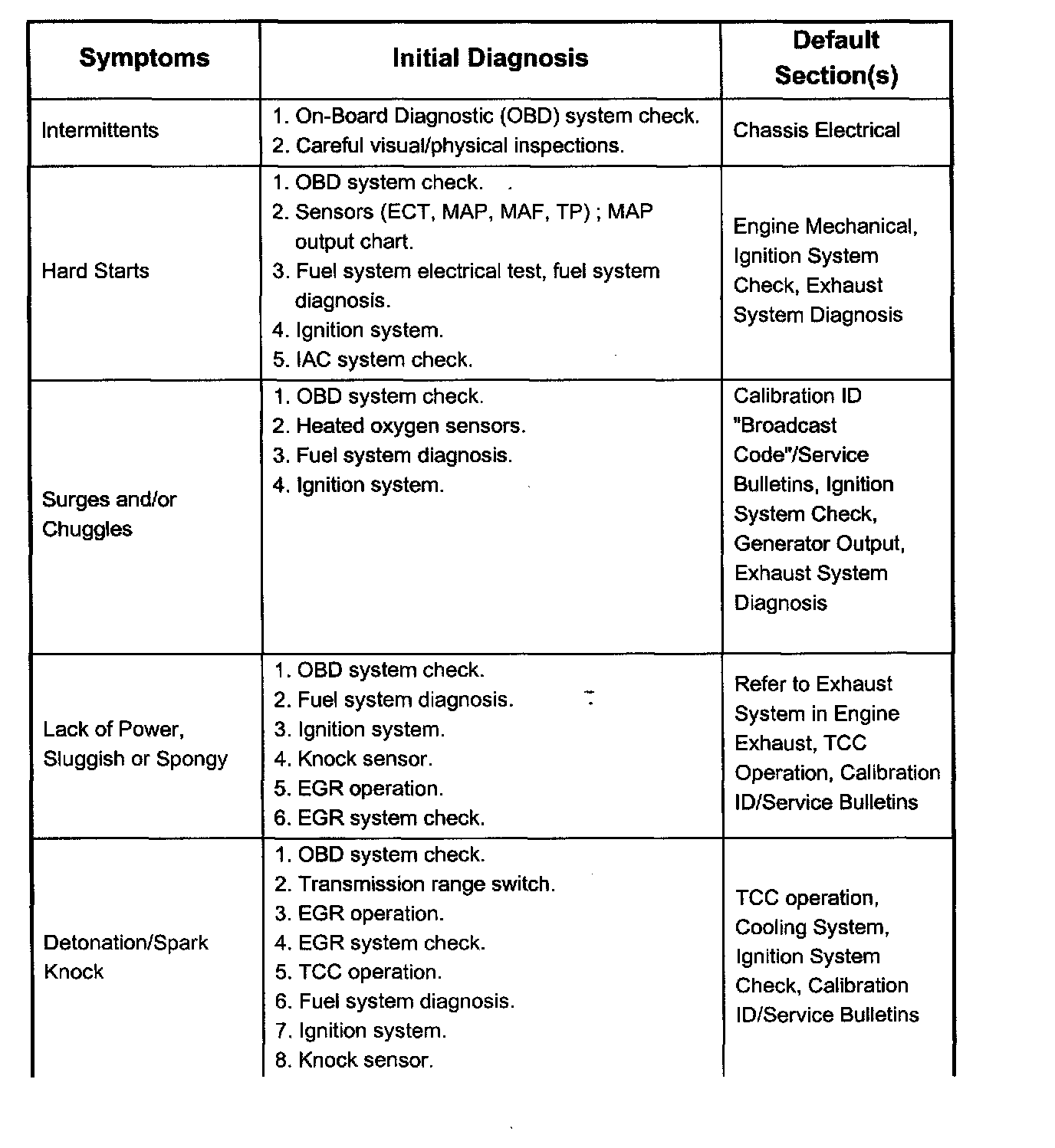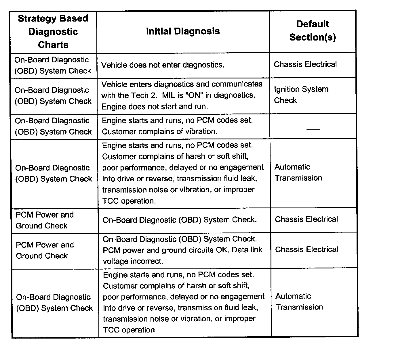 Service Procedure Default StrategyA referral strategy has been established to assist the technician with additional information when the cause of the failure cannot be determined. If no problem is found after performing diagnostics, then refer to the default matrix table for further diagnostic information.
