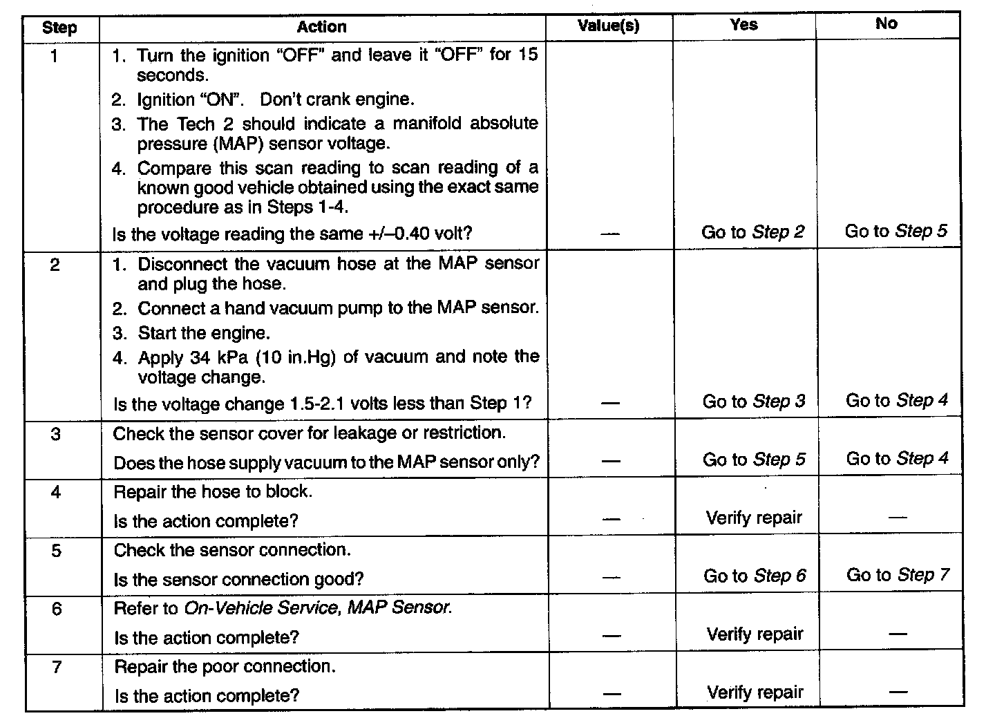2. Applying 34 kPa (10 inch Hg) vacuum to the MAP sensor should cause the voltage to be 1.5 - 2.1 volts less than the voltage at step 1. Upon applying vacuum to the sensor, the change in voltage should be instantaneous. A slow voltage change indicates a faulty sensor.
