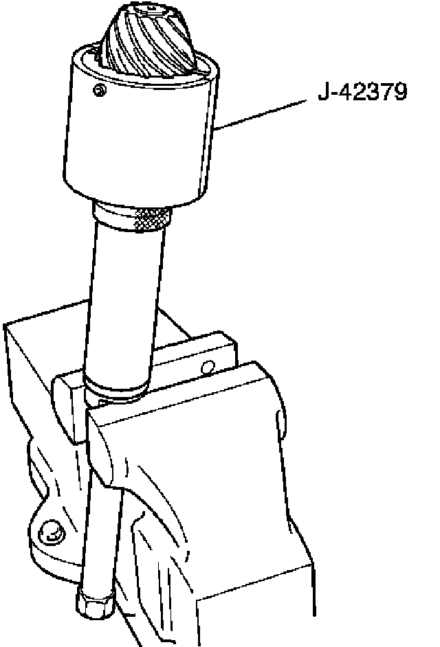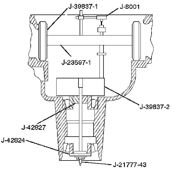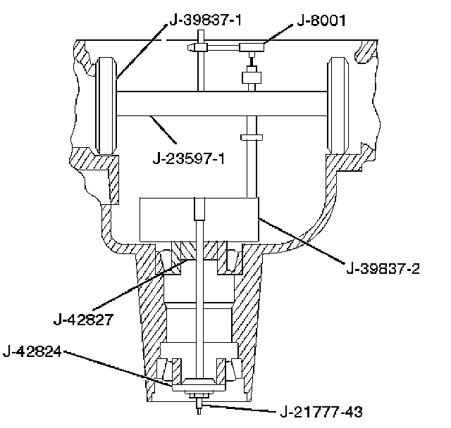 6. Install gauge plate J-39837-2, inner J-42827 stud and nut J-21777-43 and outer pilot J-42824 to the pinion bore.