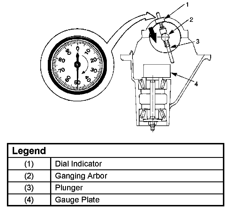 15. Position the plunger on the gauge plate. Move the gauging arbor slowly back and forth and locate the position at which the dial indicator shows the greatest defection. At this point, once again set the dial indicator to "0".